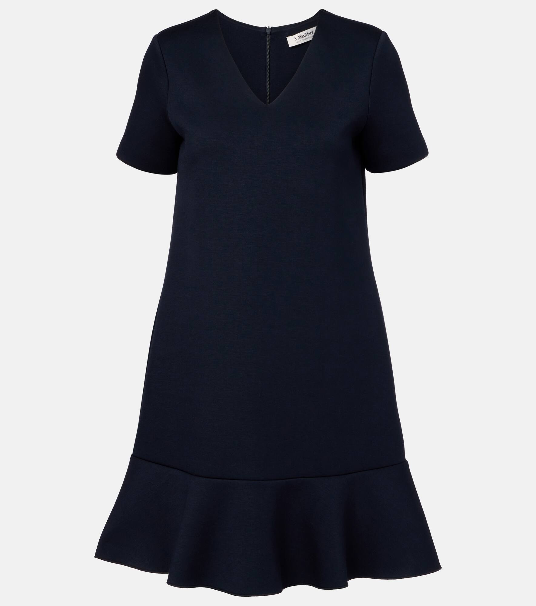 Favoring streamlined silhouettes and premium fabrics, 'S Max Mara conveys contemporary elegance. Made from jersey, the Veloce minidress features a concealed zipper closure at the back, a gently ruffled hemline, and V-shaped neckline. Product Details - Material: 96% viscose, 4% elastane - Care instructions: hand wash - Made in China - Designer color name: Classic Dark - Item color: blue - Lining: 96% viscose, 4% elastane - Closure: zipped back - Item number: P01079088 Size & Fit - True to size - Straight fit - Stretchy fabric - Non-stretchy fabric - The model seen in the picture is 178cm-5'10" and wearing a size XS