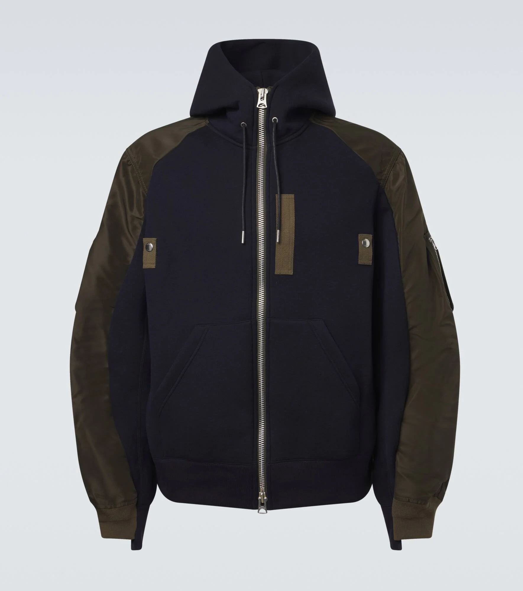 Sacai’s penchant for hybrid designs sees contrasting textures, fabrics, and techniques combined to create entirely unique and innovative styles. This hoodie features cotton-blend and nylon twill panels and is finished with ribbed trims. Product Details - Material: 62% cotton, 38% polyester - Care instructions: dry clean - Made in Japan - Color: blue - Designer color name: Navy x D/Khaki - Material II: 100% nylon - Material III: 55% polyester, 44% cotton, 1% polyurethane - Material IV: 100% cotton - Lining: 100% polyester - Filling: 100% polyester - Closure: two-way zipped front - Pockets: patch pockets, sleeve pocket - Drawstring hood - Cuff: ribbed - Hem: ribbed - Item number: P01135715 Size & Fit - True to size - Straight fit - Elasticated hem - Partly stretchy fabric - Falls to the hip - Height of model is 192cm-75.5" and wears a size 4