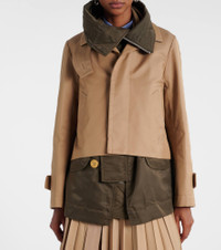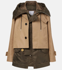 Sacai’s penchant for hybrid designs sees contrasting textures, fabrics, and techniques combined to create entirely unique and innovative styles. This modern jacket is crafted from cotton-blend gabardine layered with nylon twill elements. Product Details - Material: 63% cotton, 37% polyester - Care instructions: dry clean - Made in Japan - Designer color name: BeigexD/Khaki - Item color: beige, green - Trim: 100% nylon - Lining: 100% cupro - Lining II: 100% polyester - Filling: 100% polyester - Closure: two-way zipped front, toggle fastenings, buttoned front - Drawstring hood - Collar: classic (Straight point) - Pockets: slant pockets, snap-buttoned pockets - Drawstring waist - Cuff: buttoned - Item number: P01066710 Size & Fit - True to size - For a closer fit, we recommend taking one size down - Designed for a loose fit - Non-stretchy fabric - Falls below the hip - The model seen in the picture is 178cm-5'10" and wearing a size 1