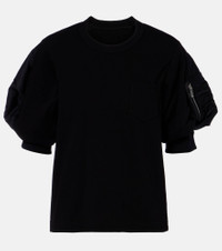 More than just a T-shirt, this Sacai piece will step up warm-weather dressing. Made from a combination of cotton jersey and nylon twill, this black style features voluminous balloon sleeves and a chest pocket. Product Details - Material: 100% cotton - Care instructions: dry clean - Made in Japan - Designer color name: Black - Item color: black - Trim: 100% nylon - Insert: 55% polyester, 44% cotton, 1% polyurethane - Lining: 100% polyester - Collar: crewneck - Pockets: patch, sleeve pocket - Cuff: ribbed - Item number: P01070183 Size & Fit - True to size - Dropped shoulders - Straight fit - Partly stretchy fabric - Falls to the hip - The model seen in the picture is 178cm-5'10" and wearing a size 1