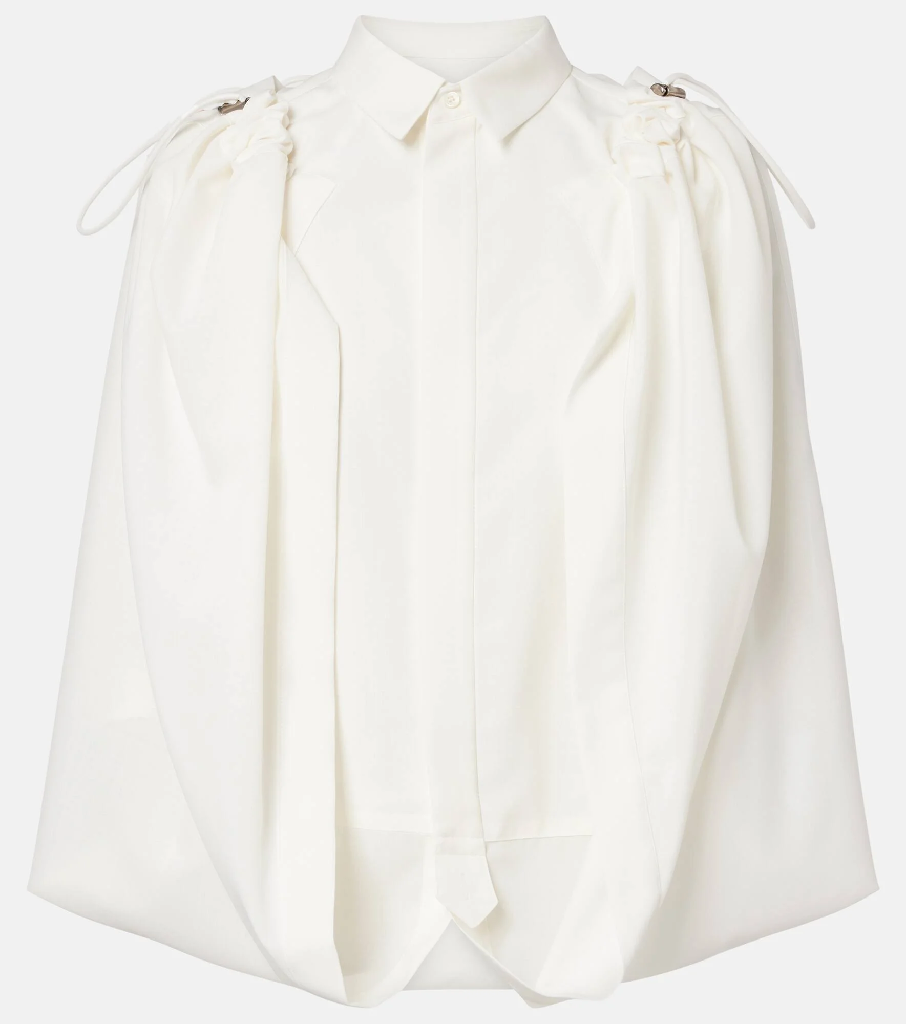 Sacai’s penchant for hybrid designs sees contrasting textures, fabrics, and techniques combined to create entirely unique and innovative styles. This polished shirt showcases voluminous panels and drawstrings on the shoulders for a gathered effect. Product Details - Material: 70% polyester, 30% wool - Care instructions: dry clean - Made in Japan - Color: white - Designer color name: Off White - Collar: classic (Straight point) - Closure: concealed buttoned front - Drawstring - Item number: P01150922 Size & Fit - True to size - Designed for a loose fit - Non-stretchy fabric - Falls to the hip - The model seen in the picture is 178cm-5'10" and wearing a size 1