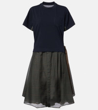 Sacai’s penchant for hybrid designs sees contrasting textures, fabrics, and techniques combined to create entirely unique and innovative styles. This midi dress features a jersey top with a chest pocket and a skirt with a Prince of Wales check pattern. Product Details - Material: 100% cupro - Care instructions: machine wash at 30 degrees - Made in Japan - Designer color name: Navy X Khaki - Item color: blue, green - Collar: crewneck - Attached belt - Pockets: angled chest pocket - Item number: P01066714 Size & Fit - True to size - Loose fit, comes with belt - Partly stretchy fabric - The model seen in the picture is 178cm-5'10" and wearing a size 1