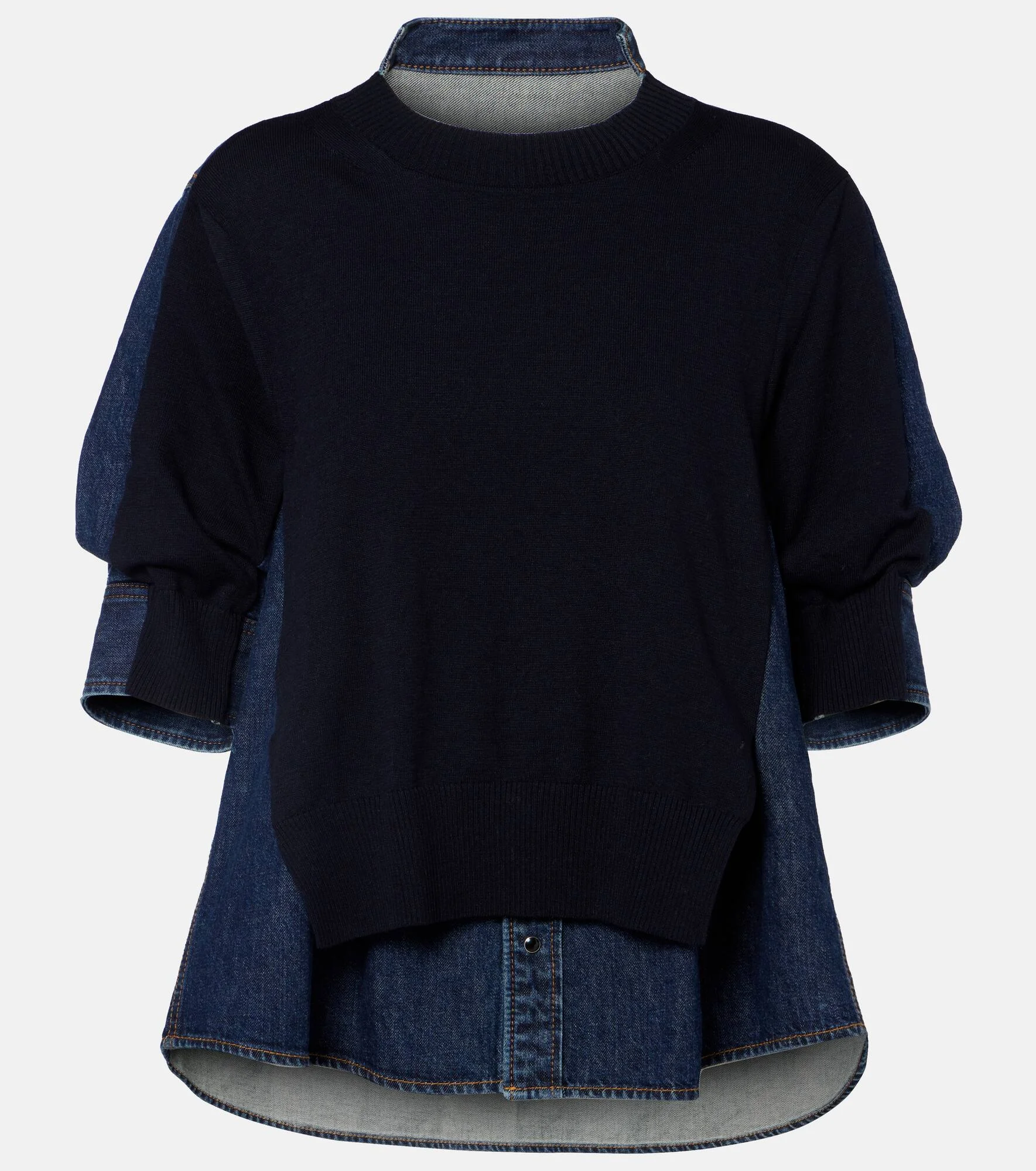 Sacai’s penchant for hybrid designs sees contrasting textures, fabrics, and techniques combined to create entirely unique and innovative styles. This statement piece boasts a remarkably layered silhouette, featuring a knitted sweater layered over a classic denim shirt. Product Details - Material: 57% cotton, 43% polyester - Care instructions: dry clean - Made in Japan - Color: blue - Designer color name: Blue - Item color: blue - Trim: 100% cotton - Lining: 100% polyester - Collar: crewneck - Cuff: ribbed - Hem: ribbed - Closure: snap-buttoned fastenings - Item number: P01149530 Size & Fit - True to size - Designed for a loose fit - Partly stretchy fabric - Falls below the hip - The model seen in the picture is 178cm-5'10" and wearing a size 0