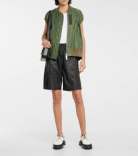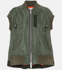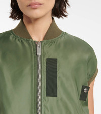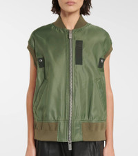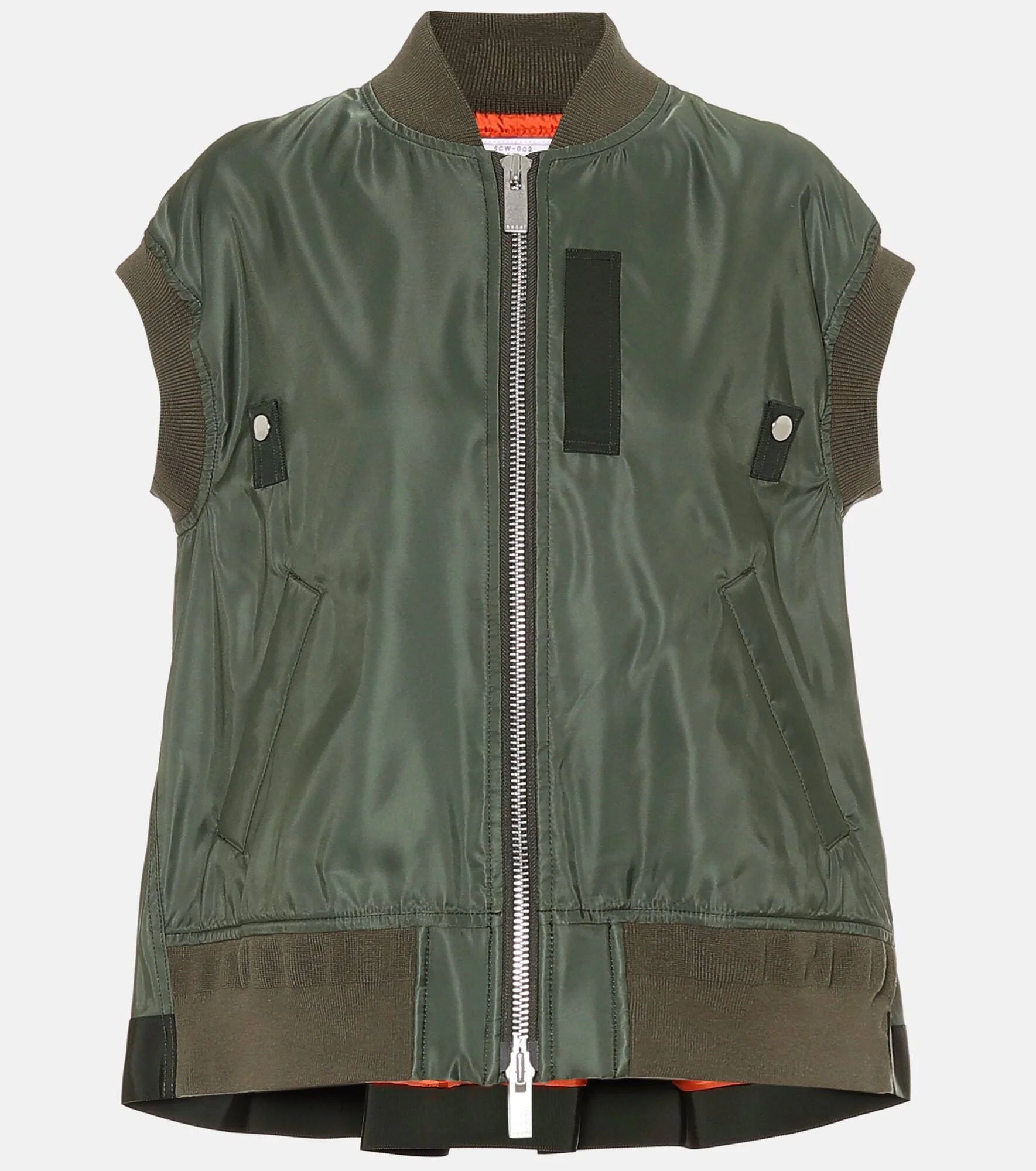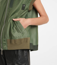 Tap Sacai's penchant for the unexpected with this khaki-green technical vest. Made in the label's native Japan from nylon, it works the brand's signature experimental shape with no sleeves, ribbed trim and a draped high-low hem. Layer yours over slinky slip dresses for a modern approach. Product Details - Trim: 50% cotton, 50% polyester - Care instructions: dry clean - Filling: 100% polyester - Closure: two-way zipped front - Designer color name: Khaki - Lining: fully lined, 100% cupro - Made in Japan - Pockets: side slit pockets - Material: 100% nylon - Item number: P00453817 Size & Fit - True to size - Designed for a loose fit - Mid-weight material - Falls to the hip - The model seen in the picture is 178cm-5'10" and wearing a size 1