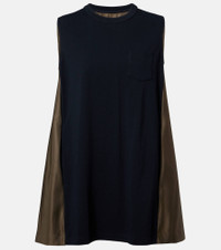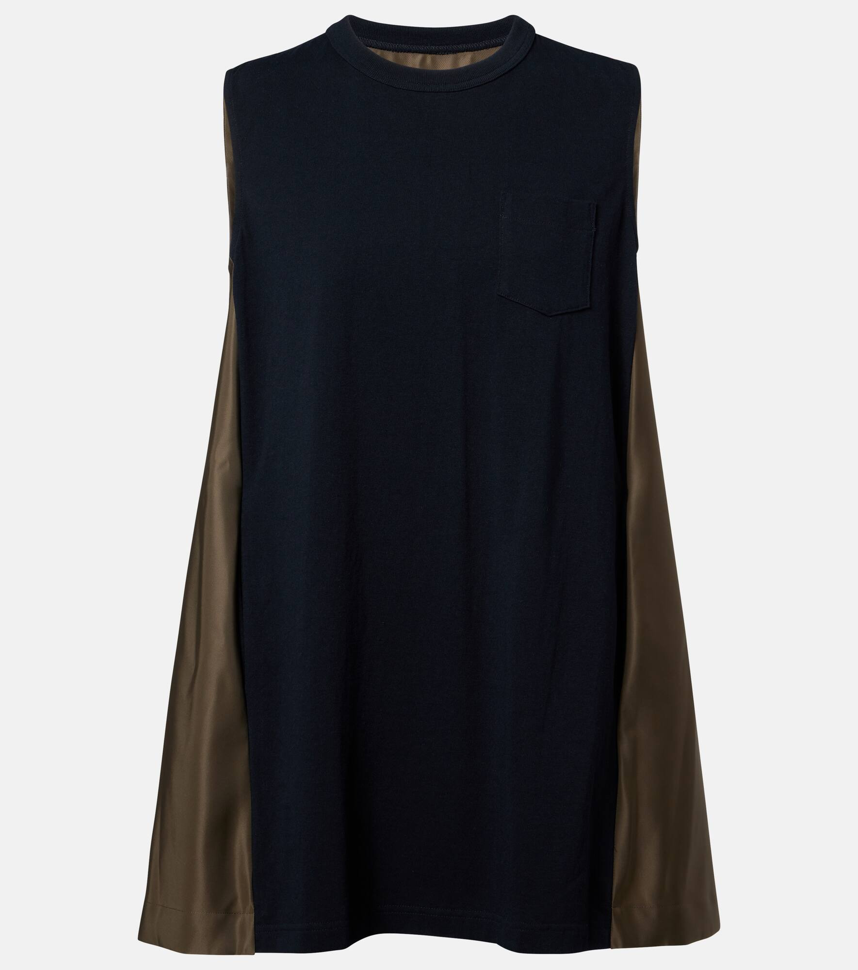 Sacai’s penchant for hybrid designs sees contrasting textures, fabrics, and techniques combined to create entirely unique and innovative styles. This minidress features a cotton jersey front panel and pleated technical back panel. Product Details - Material: 100% cotton - Care instructions: dry clean - Made in Japan - Designer color name: NavyxD/Khaki - Item color: blue, green - Material II: 100% nylon - Material III: 100% polyester - Lining: 100% cupro - Collar: crewneck - Pockets: breast pocket, side slit pockets - Item number: P01099139 Size & Fit - True to size - Designed for a loose fit - Partly stretchy fabric - The model seen in the picture is 178cm-5'10" and wearing a size 1