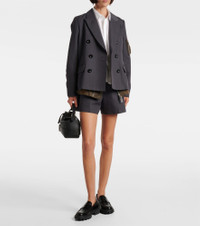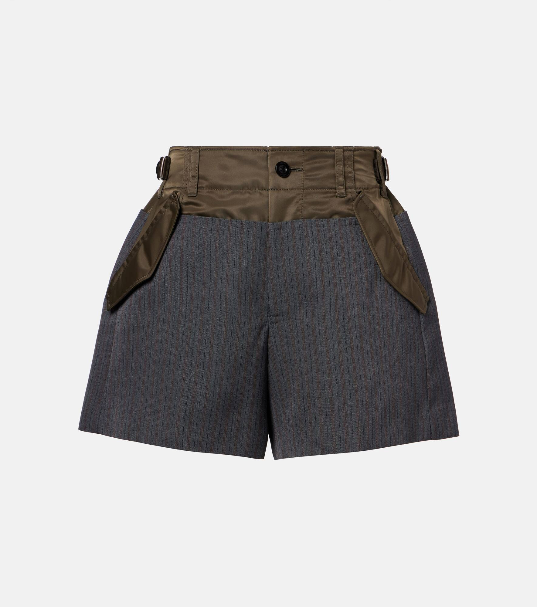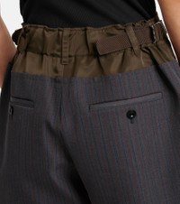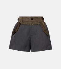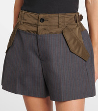 Sacai’s penchant for hybrid designs sees contrasting textures, fabrics, and techniques combined to create entirely unique and innovative styles. These paneled mid-rise shorts feature a striped pattern, adjustable tabs at the waist, and flap pockets. Product Details - Material: 55% polyester, 45% wool - Care instructions: dry clean - Made in Japan - Designer color name: GrayxD/Khaki - Item color: gray, green - Material II: 100% nylon - Lining: 100% cupro - Closure: zipper fly, button fastening - Pockets: snap-buttoned pockets, back pockets - Belt loops - Adjustable tabs at the waist - Item number: P01099124 Size & Fit - True to size - Adjustable at the waist - Non-stretchy fabric - Wide-leg - High-waisted - The model seen in the picture is 178cm-5'10" and wearing a size 1