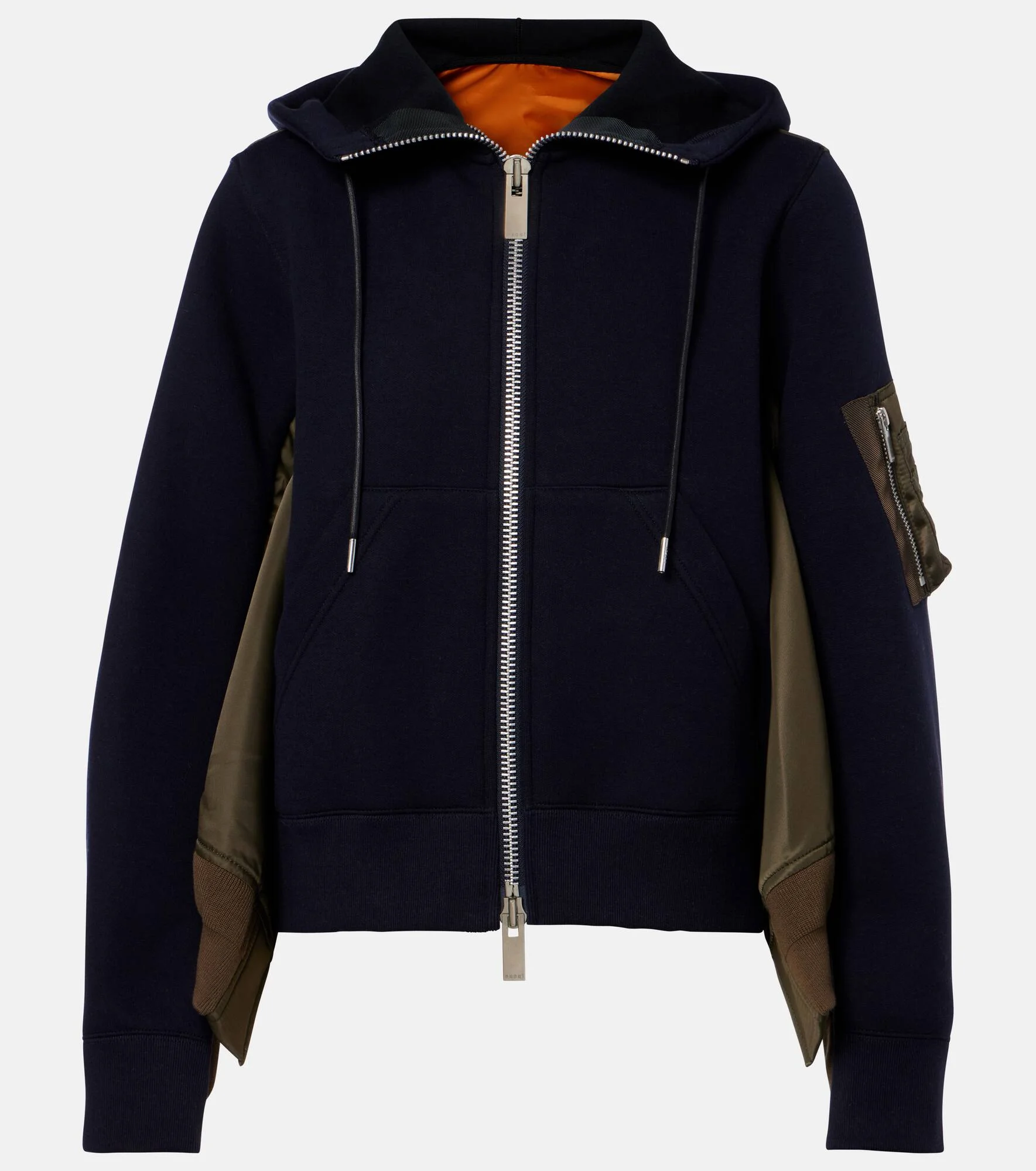 Sacai’s penchant for hybrid designs sees contrasting textures, fabrics, and techniques combined to create entirely unique and innovative styles. This hoodie features a cotton-blend jersey bodice, a zip-up design, and technical sleeve-like details. Product Details - Material: 62% cotton, 38% polyester - Care instructions: dry clean - Made in Japan - Color: blue - Designer color name: NavyxD/Khaki - Material II: 100% nylon - Material III: 100% cotton - Lining: 100% polyester - Filling: 100% polyester - Closure: two-way zipped front - Pockets: kangaroo pocket - Drawstring hood - Item number: P01150938 Size & Fit - True to size - Straight fit - Partly stretchy fabric - Falls to the hip - The model seen in the picture is 178cm-5'10" and wearing a size 0