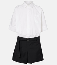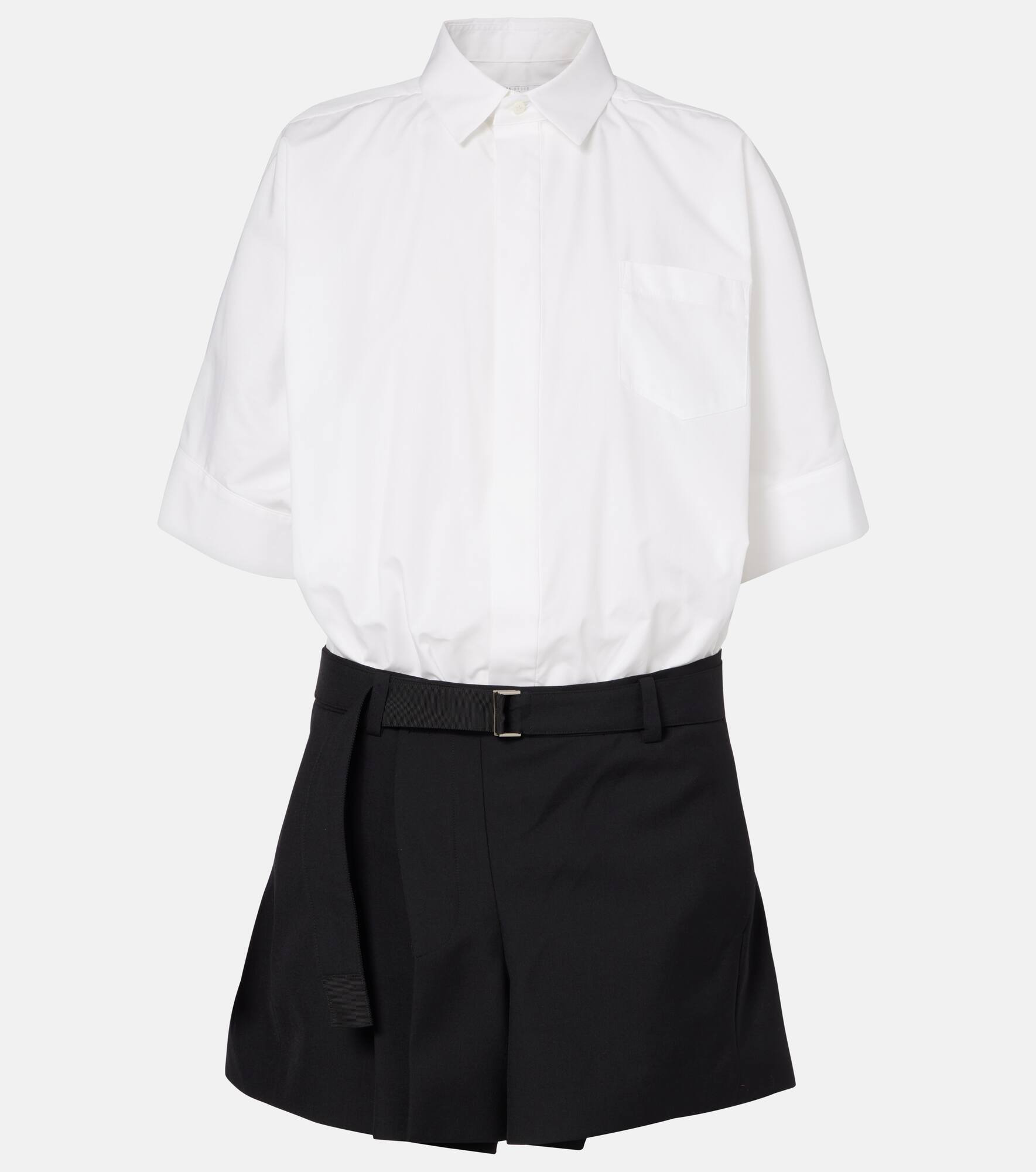 Sacai’s penchant for hybrid designs sees contrasting textures, fabrics, and techniques combined to create entirely unique and innovative styles. Inspired by classic tailored silhouettes, this minidress features a poplin and suiting fabric construction. Product Details - Material: 65% polyester, 35% cotton - Care instructions: dry clean - Made in Japan - Designer color name: Off White x Black - Item color: white, black - Material II: 70% polyester, 30% wool - Closure: concealed button placket, zipper fly, button fastening - Pockets: back pockets - Detachable belt - Belt loops - Item number: P01066704 Size & Fit - True to size - Loose fit, comes with belt - Non-stretchy fabric - The model seen in the picture is 178cm-5'10" and wearing a size 1