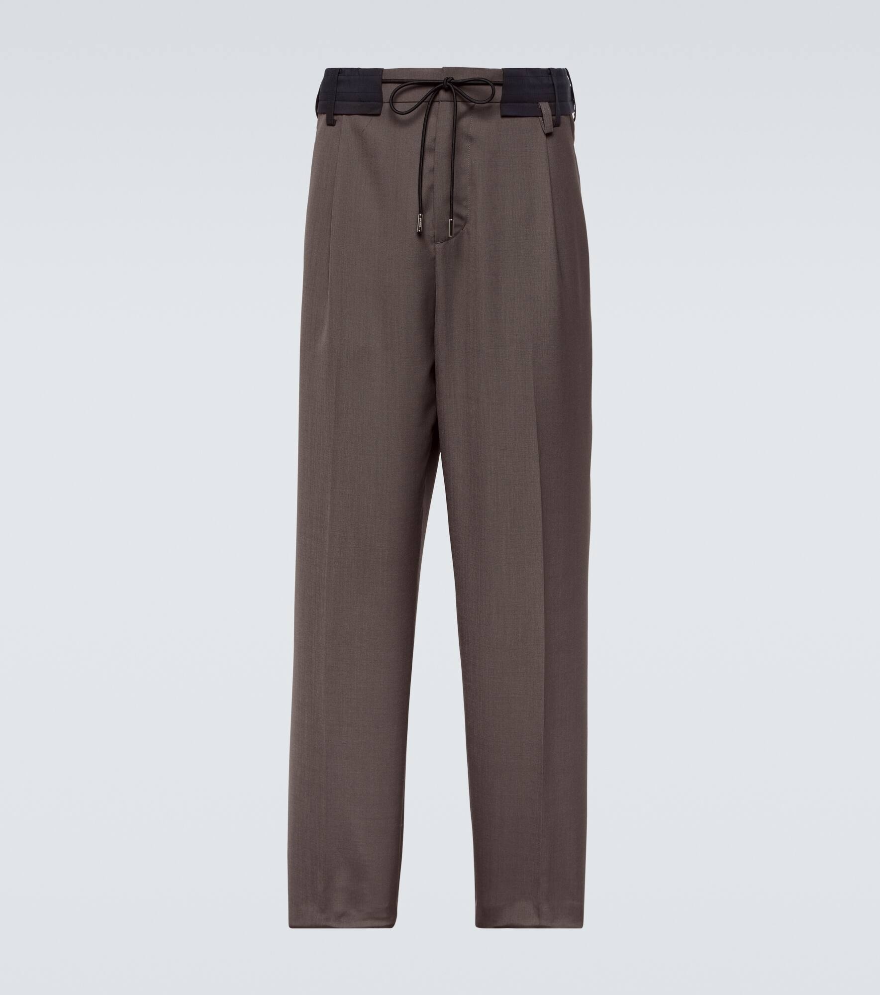 Product Details - Material: 70% polyester, 30% wool - Care instructions: dry clean - Made in Japan - Designer color name: Taupe - Material II: 60% cotton, 40% nylon - Lining: 100% cupro - Closure: zipper fly, button fastening - Pockets: side slit pockets, back pockets - Item number: P00892607 Size & Fit - True to size - Elasticated waist - Adjustable at the waist - Non-stretchy fabric - Wide-leg - The model in the picture is 185cm-6'1" and wearing a size 3