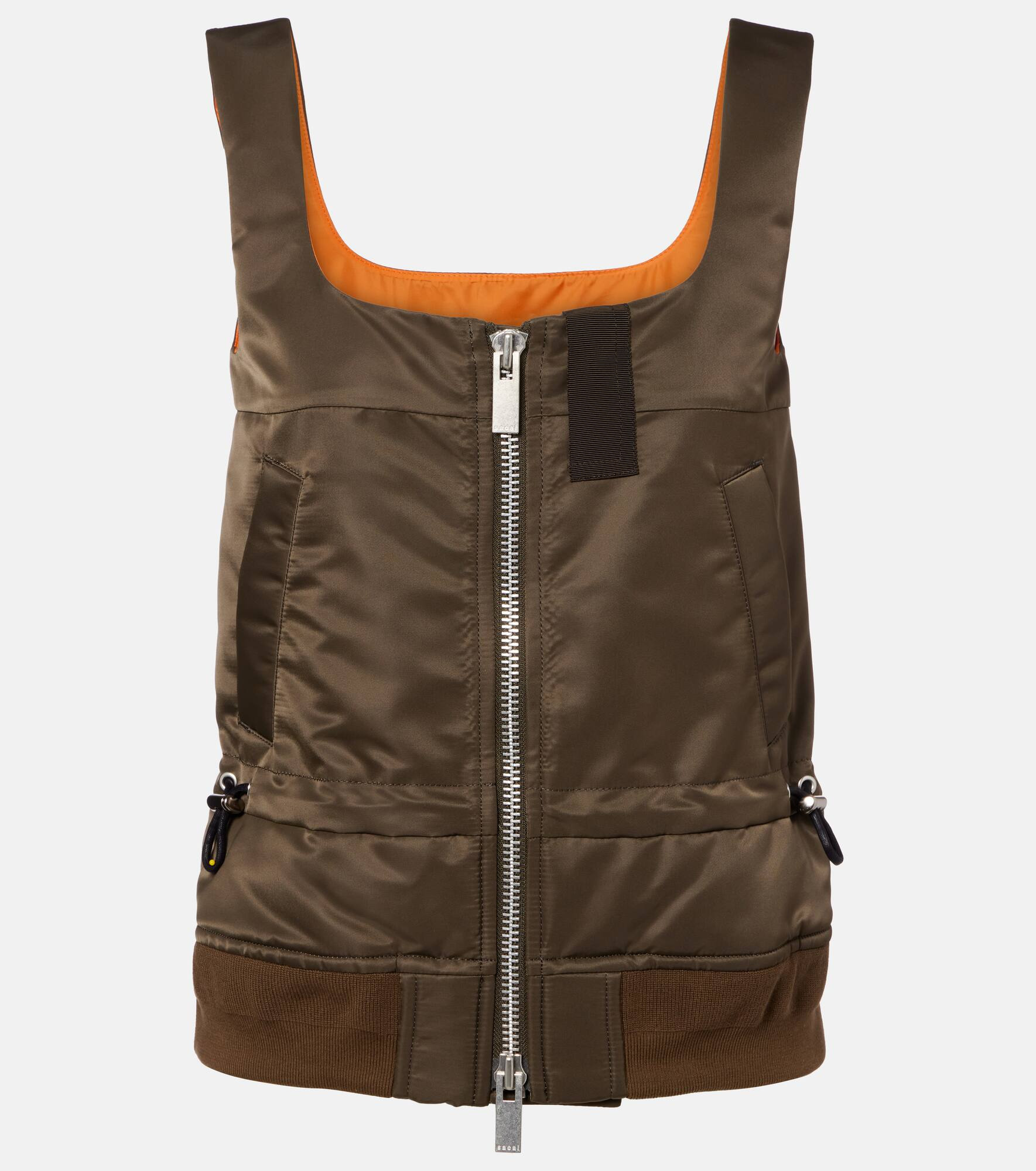 Known for its experimental pieces and innovative design philosophy, Sacai appeals most to style innovators. This tank top is made from technical nylon fabrication and features a zipper down the front. Product Details - Material: 100% nylon - Care instructions: dry clean - Made in Japan - Designer color name: D/Khaki - Item color: green - Material II: 55% polyester, 44% cotton, 1% polyurethane - Lining: 100% polyester - Filling: 100% polyester - Hardware color: silver - Pockets: snap-buttoned pockets - Drawstring waist - Closure: two-way zipped front - Item number: P01099131 Size & Fit - True to size - Loose fit, drawstring waist - Elasticated hem - Non-stretchy fabric - Falls to the hip - The model seen in the picture is 178cm-5'10" and wearing a size 1