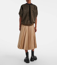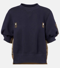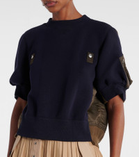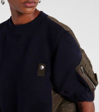 Sacai’s penchant for hybrid designs sees contrasting textures, fabrics, and techniques combined to create entirely unique and innovative styles. Halfway between a sweatshirt and a T-shirt, this top is made from cotton-blend jersey and nylon twill. Product Details - Material: 62% cotton, 38% polyester - Care instructions: dry clean - Made in Japan - Designer color name: Navy X Khaki - Item color: blue, green - Trim: 100% nylon - Material II: 100% cotton - Material III: 55% polyester, 44% cotton, 1% polyurethane - Lining: 100% cupro - Collar: crewneck - Cuff: ribbed - Hem: ribbed - Pockets: sleeve pocket - Item number: P01066719 Size & Fit - True to size - Designed for a loose fit - Partly stretchy fabric - Falls to the hip - The model seen in the picture is 178cm-5'10" and wearing a size 1