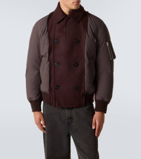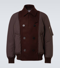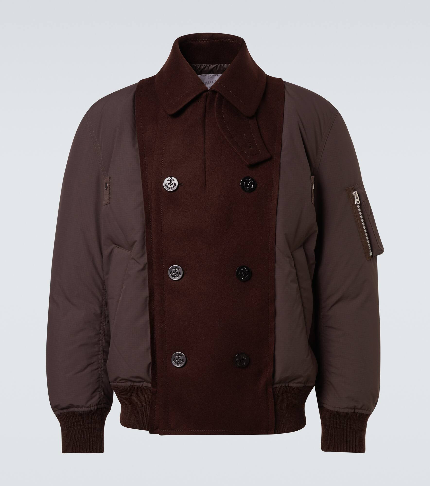 An elevated twist on a classic, this Sacai bomber jacket fuses utility with refined tailoring. This style is distinguished by a double-breasted front panel in wool for a structured, contemporary edge. Product Details - Material: 100% wool - Care instructions: specialist clean - Made in China - Designer color name: Brown - Item color: brown - Material II: 100% polyester - Trim: 53% acrylic, 36% wool, 10% polyester, 1% polyurethane - Closure: double-breasted (six buttons) - Pockets: snap-buttoned pockets, sleeve pocket - Item number: P01068424 Size & Fit - True to size - Designed for a loose fit - Elasticated hem - Non-stretchy fabric - Falls to the hip - Height of model is 188cm-74" and wears a size 3