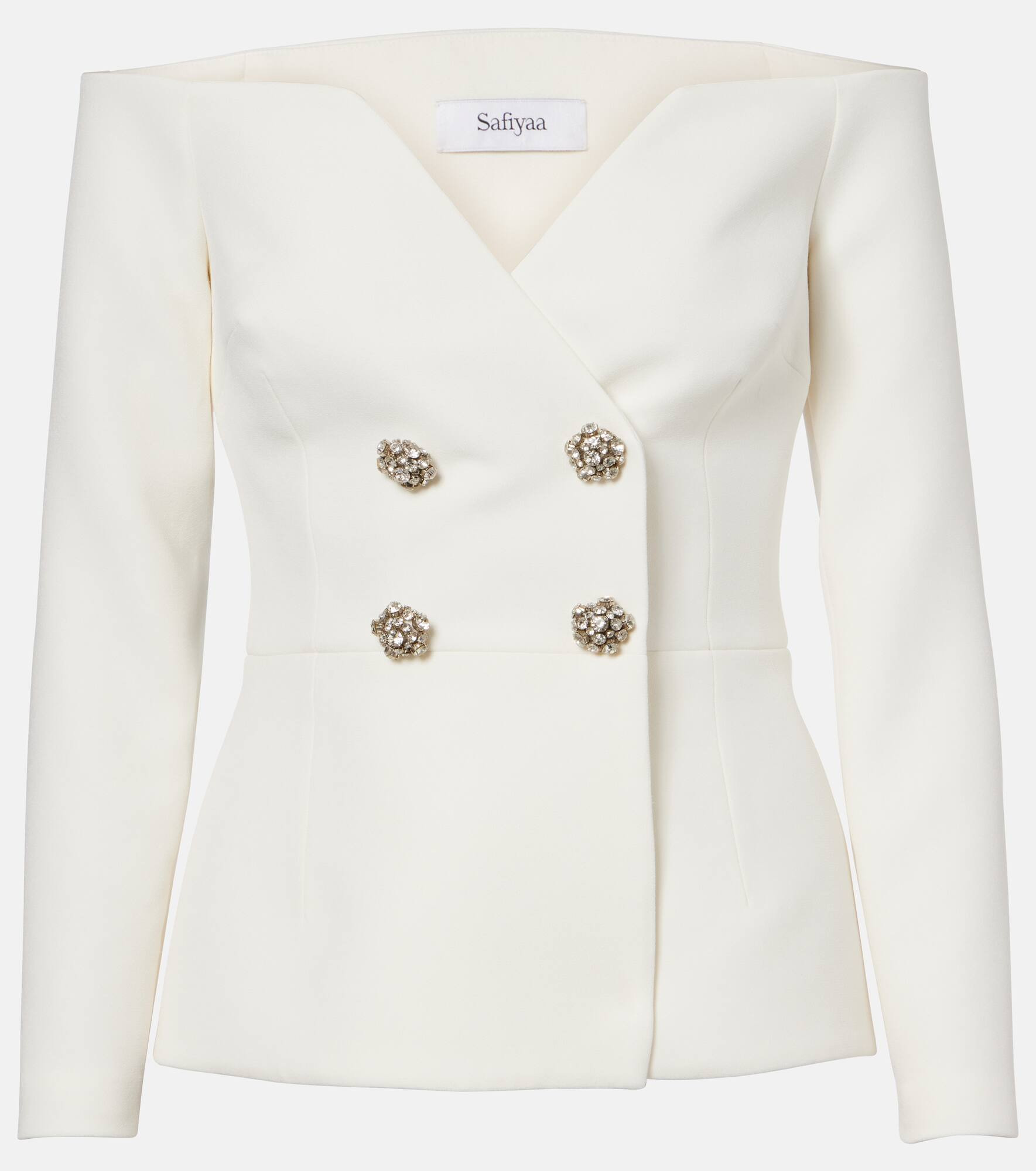The Bridal Kamile jacket features an off-shoulder neckline and crystal-embellished double-breasted front. This piece is made from Safiyaa's signature heavy crepe – a fabric that is favored for its graceful draping qualities. Product Details - Material: 92% polyester, 8% elastane - Care instructions: dry clean - Made in Lithuania - Designer color name: Ivory With Crystal - Item color: white - Hardware color: silver - Lining: 97% polyester, 3% elastane - Trim: 70% glass, 30% metal - Cuff: zipped - Closure: double-breasted (four buttons) - Item number: P01101580 Size & Fit - True to size - Ideal fit for larger bust sizes - Off-the-shoulder - Cinched waist - Non-stretchy fabric - Falls to the hip - The model seen in the picture is 178cm-5'10" and wearing a size FR 36