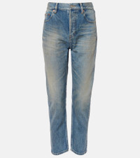 Since its conception in 1961, Saint Laurent has been coveted for its elegant Parisian aesthetic. The '90s jeans are aptly named for their cropped, slim-leg silhouette. Product Details - Material: 100% cotton - Care instructions: machine wash at 30 degrees - Made in Japan - Color: blue - Designer color name: Midi Blue - Item color: blue - Pocket lining: 100% cotton - Details: 100% calf leather - Contains non-textile parts of animal origin - Hardware color: silver - Closure: concealed button placket - Belt loops - Pockets: five pockets - Item number: P01128223 Size & Fit - Fits small to size - we recommend trying one size larger - Non-stretchy fabric - Slim-leg - High-rise - The model seen in the picture is 178cm-5'10" and wearing a size 27
