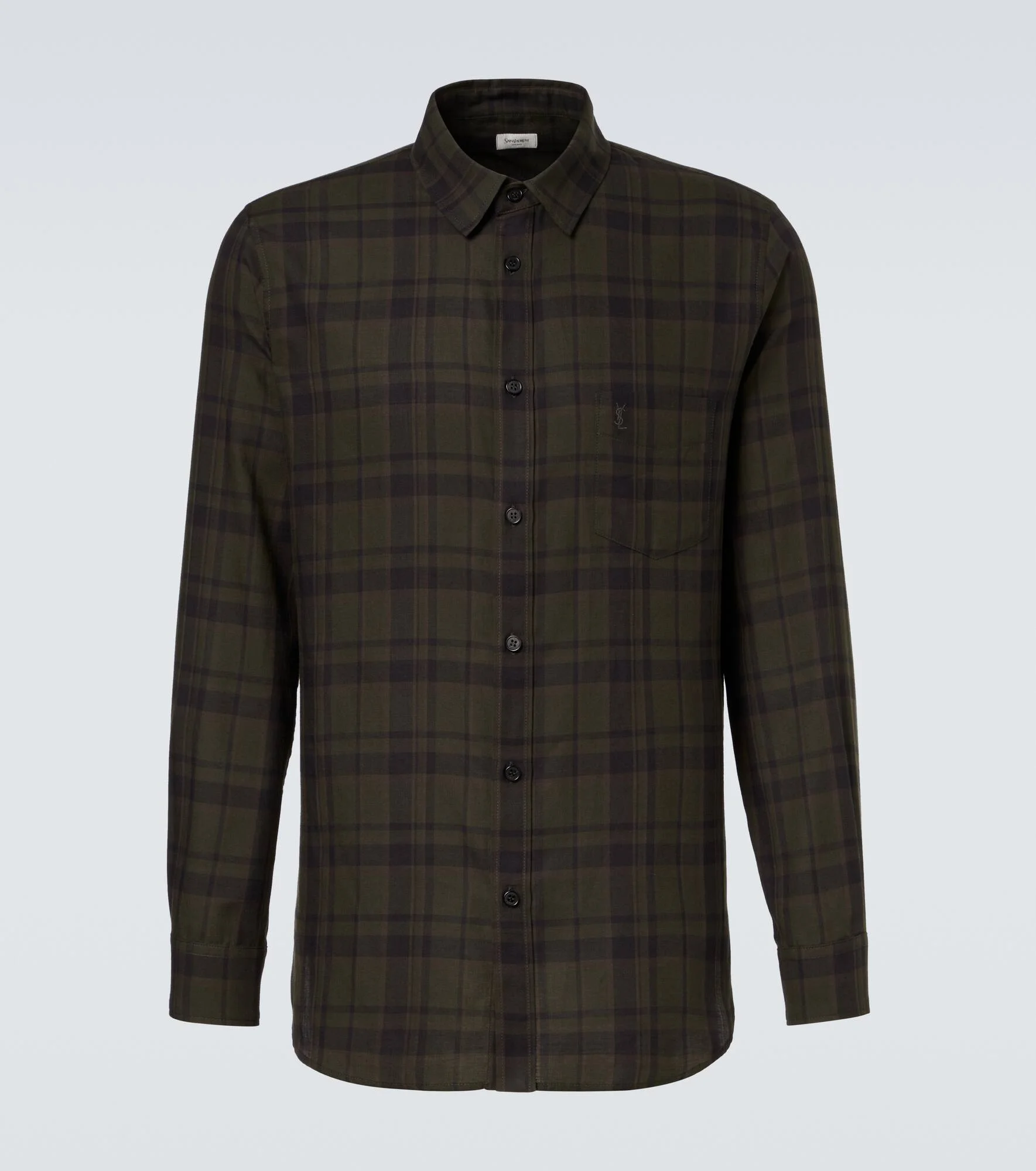 One of the most famous symbols in fashion, the YSL monogram consists of the intertwined initials of Saint Laurent's founder. It's embroidered at the heart of this shirt, made in Italy from checked cotton flannel. Product Details - Material: 100% cotton - Care instructions: dry clean - Made in Italy - Designer color name: Falkland Check Od - Item color: green - Contains non-textile parts of animal origin - Collar: classic (Straight point) - Closure: buttoned front - Pockets: breast pocket - Item number: P01080748 Size & Fit - True to size - Without pleats in the back - Classic fit - Non-stretchy fabric - Falls below the hip - Height of model is 192cm-75.5" and wears a size L