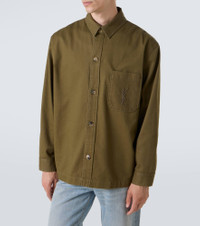 Crafted in Italy from cotton and linen, this overshirt showcases the Cassandre motif in tonal embroidery at the chest. One of the most famous symbols in fashion, the YSL monogram consists of the intertwined initials of Saint Laurent's founder. Product Details - Material: 80% cotton, 20% linen - Care instructions: machine wash at 30 degrees - Made in Italy - Designer color name: Vintage Kaki - Item color: green - Contains non-textile parts of animal origin - Closure: buttoned front - Item number: P01080764 Size & Fit - True to size - Dropped shoulders - Without pleats in the back - Designed for a loose fit - Non-stretchy fabric - Falls below the hip - Height of model is 189cm-74.5" and wears a size L