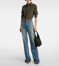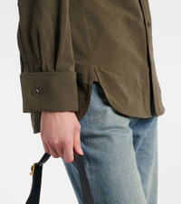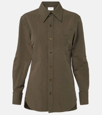 One of the most famous symbols in fashion, the YSL monogram consists of the intertwined initials of Saint Laurent's founder. The Cassandre cotton and linen shirt features a curved hem and the brand's logo embroidered at the chest pocket. Product Details - Material: 50% cotton, 50% linen - Care instructions: dry clean - Made in Italy - Designer color name: Kaki - Embroidery: 100% polyester - Closure: button-down - Pockets: breast pocket - Item number: P01012758 Size & Fit - Fits small to size - we recommend trying one size larger - Cinched waist - Non-stretchy fabric - Falls below the hip - The model seen in the picture is 178cm-5'10" and wearing a size FR 36