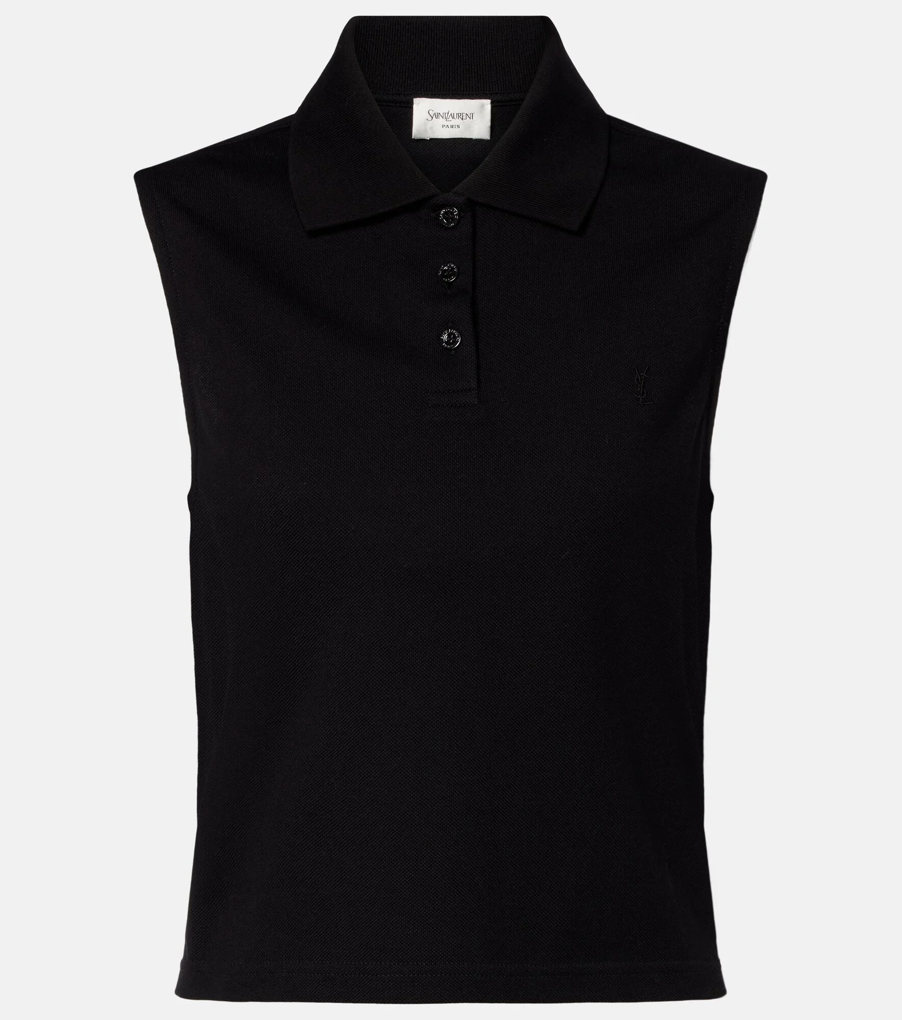 Since its conception in 1961, Saint Laurent has been coveted for its elegant Parisian aesthetic. This polo-style top is ribbed-knit from pure cotton pique with tonal Cassandre embroidery at the chest. Product Details - Material: 100% cotton - Care instructions: machine wash at 30 degrees - Made in Italy - Color: black - Designer color name: Noir - Item color: black - Collar: polo collar - Closure: buttoned placket - Side slits - Item number: P01128202 Size & Fit - True to size - Straight fit - Non-stretchy fabric - Slightly cropped - The model seen in the picture is 178cm-5'10" and wearing a size XS
