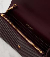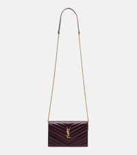 Saint Laurent's Cassandre wallet on chain will be your new evening plus-one. The envelope style is made from red matelasse leather with the brand's signature YSL monogram hardware on the flap. It's completed with two main compartments, ten card slots, and a detachable chain strap. Product Details - Material: leather - Lining: leather - Made in Italy - Designer color name: Rouge Cabernet - Item color: burgundy - Detachable chain and leather shoulder strap - Internal details: internal slot pocket, Card slots, internal zipped pocket - Color of chain strap: gold - Hardware color: gold - Closure: snap-buttoned fastening - Includes: dust bag, box - Item number: P01070066 Size & Fit - Height 12cm-4.5" - Width 19cm-7.5" - Depth 4cm-1.5" - Chain length 118cm-46.5"