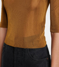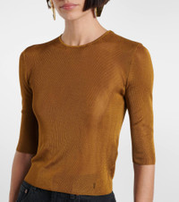 Fill your wardrobe with chic, versatile essentials like this semi-sheer top. Crafted from a super fine knit, this design features elbow-length sleeves and a small Cassandre stitched on the hem. Product Details - Material: 100% viscose - Care instructions: dry clean - Made in Italy - Designer color name: Mordore - Item number: P01032263 Size & Fit - True to size - Semi-sheer - Cinched waist - Stretchy fabric - Slightly cropped - The model seen in the picture is 178cm-5'10" and wearing a size XS