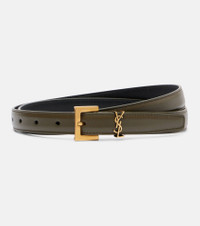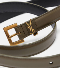 One of the most famous symbols in fashion, the YSL monogram consists of the intertwined initials of Saint Laurent's founder. Here in gold, it adorns the front of this slim leather belt, finished with a squared buckle. Product Details - Material: calf leather - Lining: leather - Made in Italy - Designer color name: Artichocke Green - Item color: green - Hardware color: bronze - Closure: buckle fastening - Includes: dust bag - Item number: P01090513 Size & Fit - Width 2cm-1" - Length of size 65 = 60/70cm-23.5/27.5" - Length of size 70 = 66/76cm-26/30" - Length of size 75 = 71/81cm-28/32" - Length of size 80 = 76/86cm-30/34"