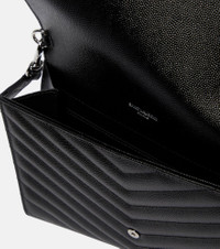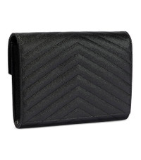 Saint Laurent updates its iconic Cassandre leather clutch in timeless black. The sleek silhouette has been made from grained leather with a quilted chevron finish. The label's signature YSL detail adorns the design in a glossy golden tone that promises to bring a glamorous finish to your look, day or night. Product Details - Closure: snap-buttoned fastening - Color of fastening: silver - Internal details: fabric lining, internal slot pocket - Material: calf leather - Comes with dust bag - Comes with a box - Made in Italy - Detachable top handle - Item number: P00709777 Size & Fit - Height 15,5cm-6" - Width 21cm-8.5" - Depth 3cm-1" - Length of wrist strap %cm%cm-0.85"