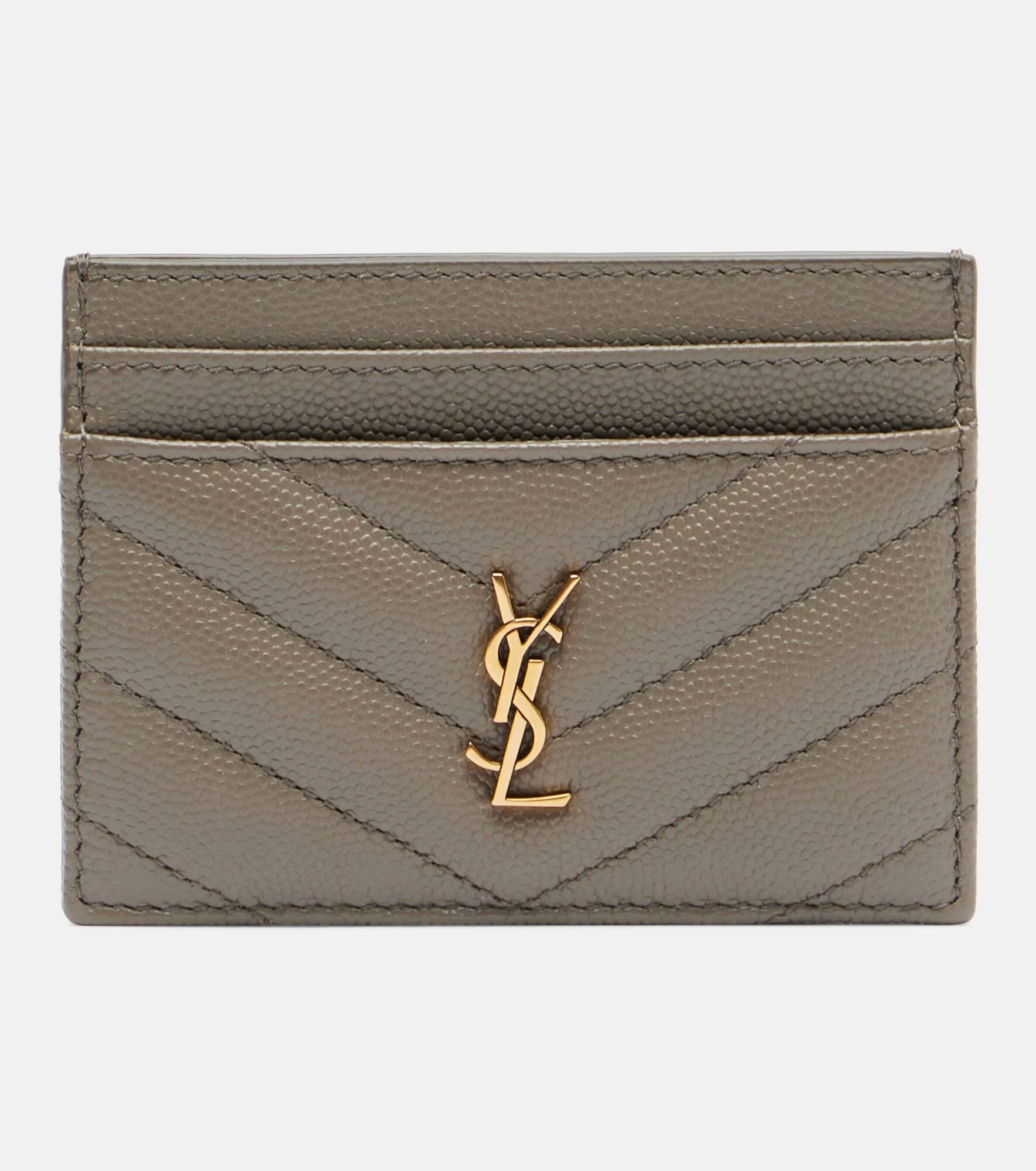One of the most famous symbols in fashion, the YSL monogram consists of the intertwined initials of Saint Laurent's founder. The Cassandre card holder is crafted from matelasse leather and topped with the unmistakable logo. Product Details - Material: calf leather - Lining: fabric - Made in Italy - Color: brown - Designer color name: Light Taupe - Item color: brown - Hardware color: gold - Internal details: Card slots, bill slot - Item number: P01133844 Size & Fit - Height 7,5cm-3" - Width 10,5cm-4"
