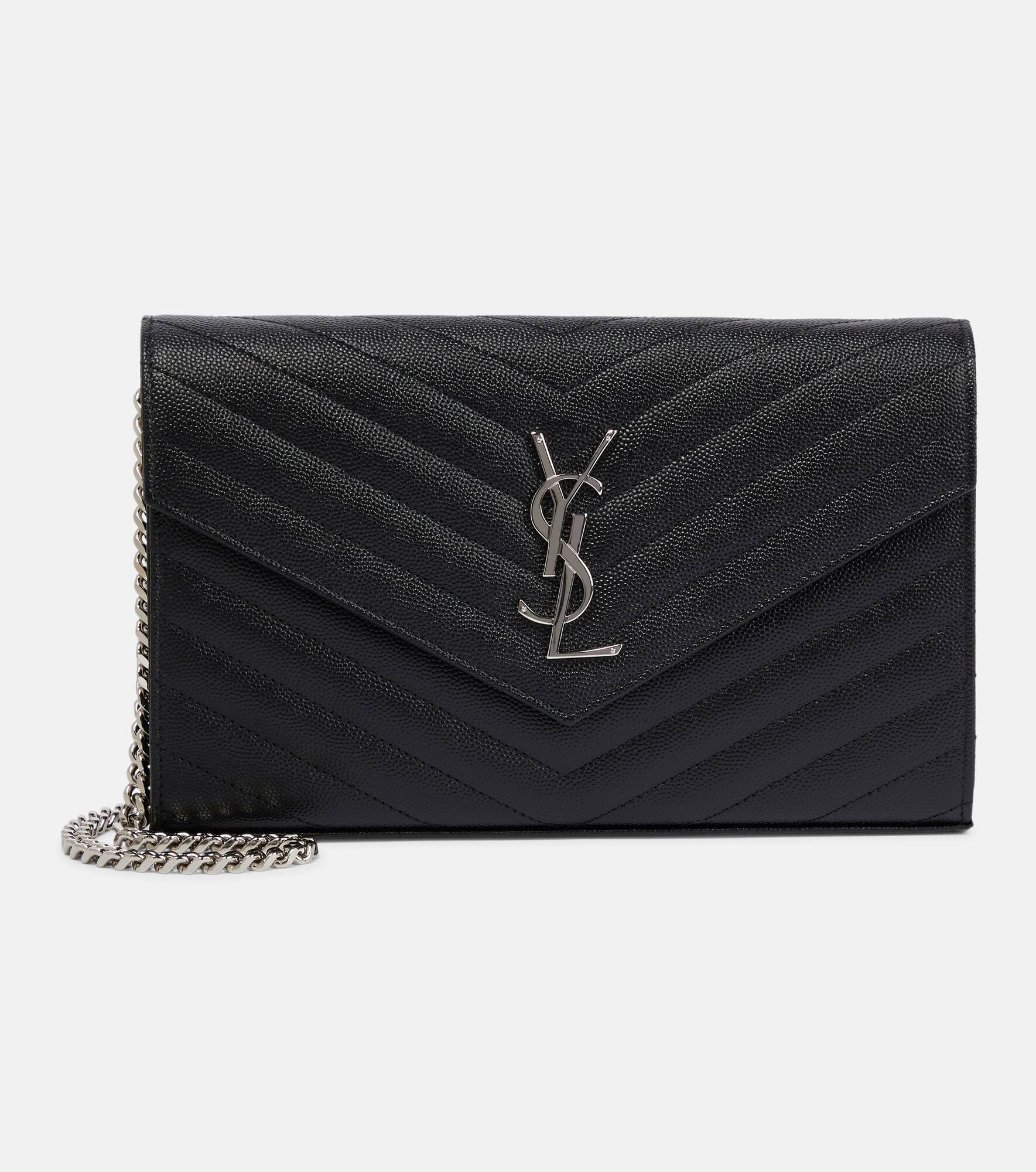 Saint Laurent's Cassandre wallet on chain will be your new evening plus-one. It's made from black Grain de Poudre embossed matelassé leather with the brand's signature YSL monogram hardware on the flap. The design is complete with two main compartments, ten card slots, and a detachable chain strap. Product Details - Internal details: internal slot pocket, leather lining, two internal compartments, internal zipped pouch, Card slots - Closure: snap-buttoned fastening - Comes with a box - Material: calf leather - Made in Italy - Designer color name: Nero - Comes with dust bag - Color of fastening: silver - Detachable, adjustable chain and leather shoulder strap - Item number: P00668617 Size & Fit - Height 14cm-5.5" - Width 22,5cm-9" - Depth 4cm-1.5" - Chain length 105cm-41.5" - Suitable for large smartphones (e.g. iPhone 12 Pro Max / Samsung Galaxy A72, S21 Ultra/ Huawei P40 Pro, Mate 40 pro)