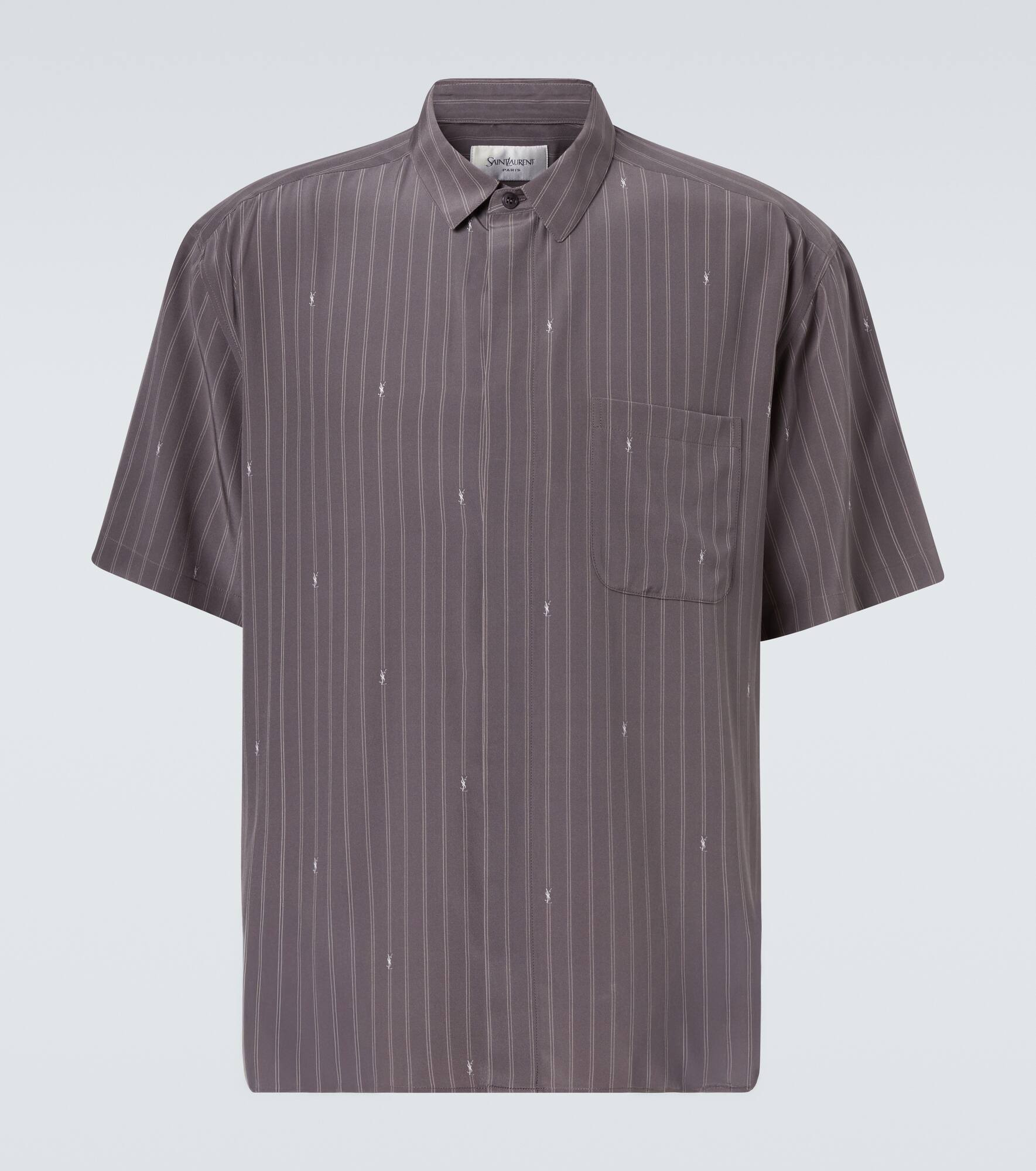 Since its conception in 1961, Saint Laurent has been coveted for its elegant Parisian aesthetic. Made from soft silk crepe de chine, this shirt features a pointed collar, a breast pocket, and a striped pattern enriched with the Cassandre detailing. Product Details - Material: 100% silk - Care instructions: dry clean - Made in Italy - Designer color name: Gris Blank - Item color: gray - Closure: concealed buttoned front - Pockets: breast pocket - Collar: classic (Straight point) - Item number: P01080737 Size & Fit - True to size - Dropped shoulders - With pleats in the back - Classic fit - Non-stretchy fabric - Falls to the hip - Height of model is 189cm-74.5" and wears a size EU 41