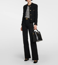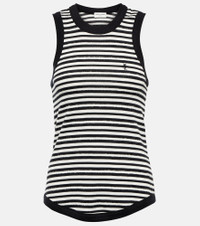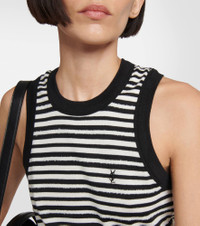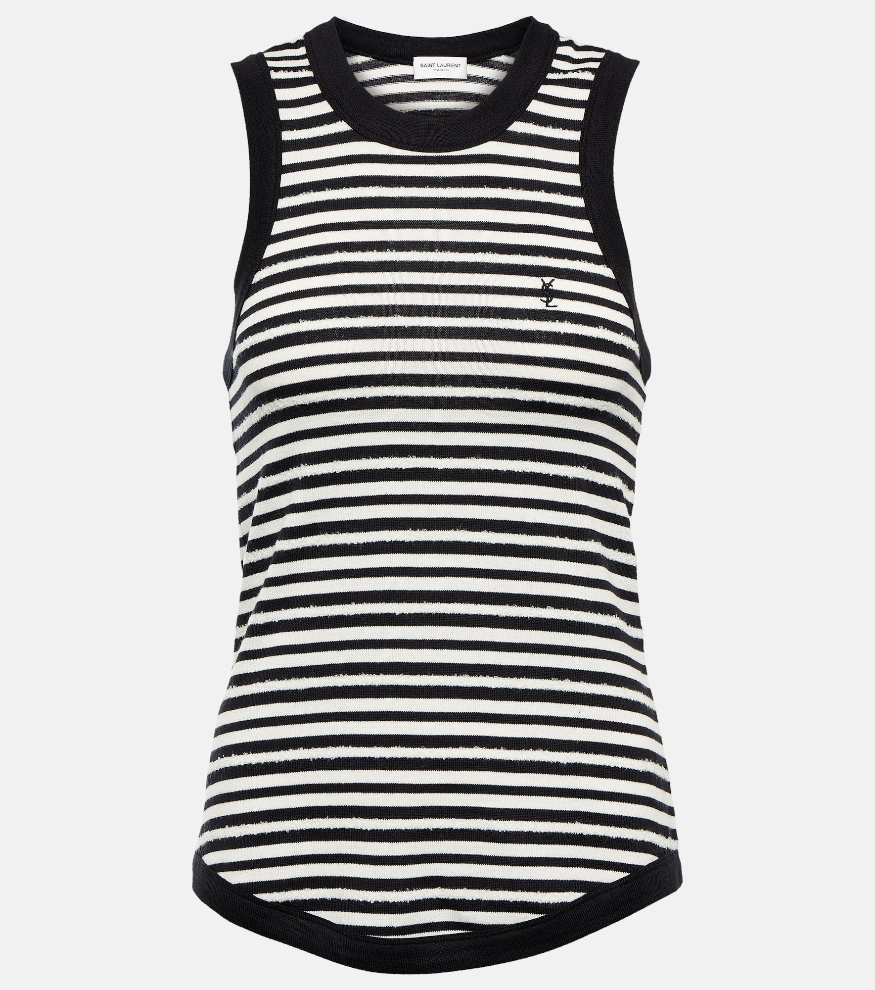 A contemporary take on a timeless classic, the Cassandre top from Saint Laurent has a fitted silhouette and tonal monogram embroidery at the chest. It’s made from a striped cotton blend piqué. Product Details - Material: 10% polyamide, 21% acrylic, 69% cotton - Care instructions: hand wash - Made in France - Designer color name: Noir/Naturel - Embroidery: 100% viscose - Material II: 100% cotton - Item number: P00799901 Size & Fit - True to size - Straight fit - Mid-weight material - Falls to the hip - The model seen in the picture is 178cm-5'10" and wearing a size XS