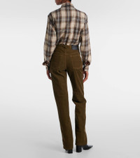 Add an edgy flair to your everyday ensembles with the Clyde pants from Saint Laurent. Crafted from cotton corduroy, this pair features a classic 5-pocket construction and a wide-leg silhouette. Product Details - Material: 100% cotton - Care instructions: machine wash at 30 degrees - Made in Italy - Designer color name: Hunting Kaki - Item color: green - Details: 100% calf leather - Contains non-textile parts of animal origin - Hardware color: antique gold - Closure: zip and button fastening - Pockets: five pockets - Belt loops - Item number: P01078582 Size & Fit - Fits small to size - we recommend trying one size larger - Non-stretchy fabric - Wide-leg - Mid-rise - The model seen in the picture is 178cm-5'10" and wearing a size 27