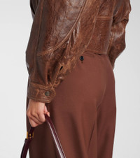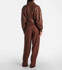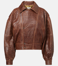 Since its conception in 1961, Saint Laurent has been coveted for its elegant Parisian aesthetic. This cropped bomber jacket is crafted from leather with a vintage feel and boasts a double-breasted silhouette. Product Details - Material: 100% lamb leather - Care instructions: specialist clean - Made in Italy - Designer color name: Brun Chene/Marron Terracotta - Item color: brown - Lining: 60% cupro, 40% cotton - Pocket lining: 100% cotton - Filling: 100% polyester - Contains non-textile parts of animal origin - Closure: zipper, snap-button fastenings - Pockets: side slit pockets, internal pocket - Collar: classic (Straight point) - Cuff: buttoned - Includes: garment bag - Item number: P01078569 Size & Fit - True to size - Dropped shoulders - Designed for a loose fit - Non-stretchy fabric - Cropped - The model seen in the picture is 178cm-5'10" and wearing a size FR 34