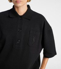 This Saint Laurent polo shirt is crafted from pure cotton and designed with an oversized silhouette for ultimate comfort. The front patch pocket boasts the YSL monogram, which consists of the intertwined initials of Saint Laurent's founder. Product Details - Material: 100% cotton - Care instructions: dry clean - Made in Italy - Designer color name: Noir - Item color: black - Embroidery: 100% polyester - Collar: polo collar - Closure: partially buttoned front - Pockets: patch pockets - Item number: P01086664 Size & Fit - True to size - For a closer fit, we recommend taking one size down - Dropped shoulders - Oversized - Non-stretchy fabric - Falls below the hip - The model seen in the picture is 178cm-5'10" and wearing a size XS