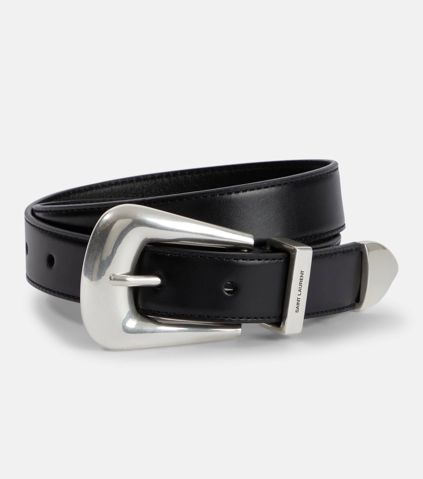 Since its conception in 1961, Saint Laurent has been coveted for its elegant Parisian aesthetic. The Folk belt is made in Italy from leather with logo engraved hardware and a pointed metal tip. Product Details - Material: leather - Lining: leather - Made in Italy - Designer color name: Black/Argent Oxyde - Closure: buckle fastening - Item number: P00833575 Size & Fit - Width 2,5cm-1" - Buckle width 5cm-2"