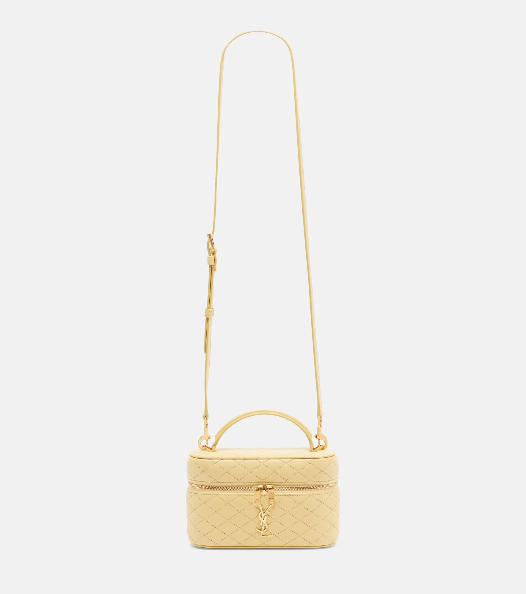 Saint Laurent creates sophisticated designs with timeless appeal, like the Gaby vanity bag. Made from diamond-quilted leather, this compact style features a detachable strap and is adorned with the maison's Cassandre motif. Product Details - Material: leather - Lining: fabric - Made in Italy - Color: yellow - Designer color name: Soft Lemon - Detachable shoulder strap - Item number: P01133811 Size & Fit - Height 11cm-4.5" - Width 18cm-7" - Depth 6,5cm-2.5" - Length of handle 16cm-6.5" - Min. length shoulder strap 103cm-40.5" - Max. length shoulder strap 113cm-44.5"