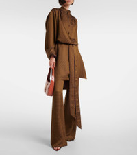 Since its conception in 1961, Saint Laurent has been coveted for its elegant Parisian aesthetic. Made in Italy, these high-rise jacquard pants have a wide-leg fit and unfinished hem. Product Details - Material: 55% acetate, 29% viscose, 16% polyester - Care instructions: dry clean - Made in Italy - Designer color name: Ocre - Item color: brown - Closure: zipper fly, button and hook fastenings - Belt loops - Contains non-textile parts of animal origin - Pockets: slant pockets, faux pockets - Hem: unfinished (ready for alteration) - Item number: P01032167 Size & Fit - True to size - Non-stretchy fabric - Wide-leg - High-waisted - Unhemmed for tailoring - The model seen in the picture is 178cm-5'10" and wearing a size FR 34