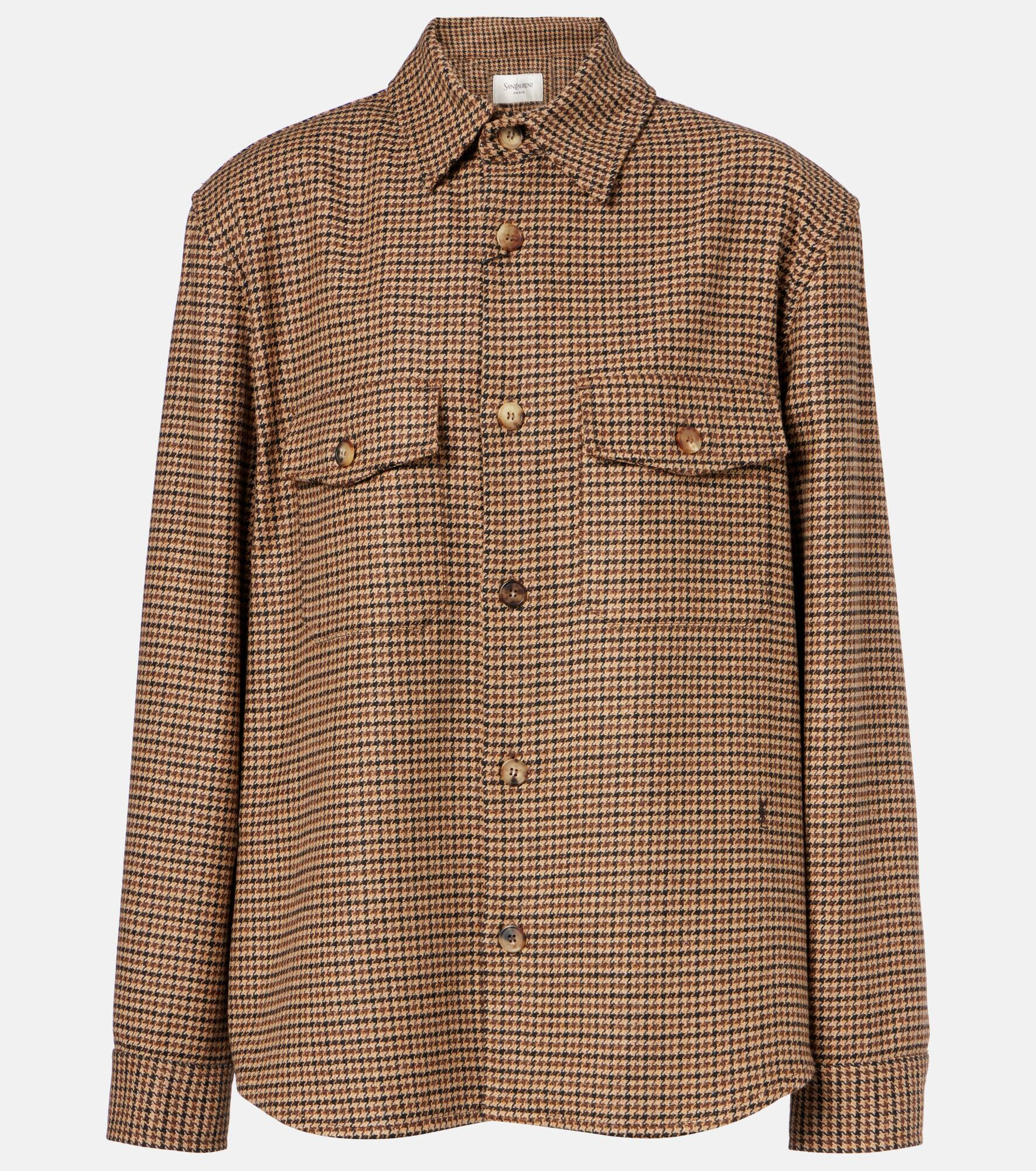 Crafted in Italy, this Houndstooth checked overshirt reflects Saint Laurent's refined Parisian aesthetic. This stylish piece features a pointed collar, single-button cuffs, shoulder pads and patch pockets with buttoned flap, offering timeless appeal. Product Details - Material: 36% wool, 31% acrylic, 23% polyester, 7% polyamide, 2% other fibres, 1% silk - Care instructions: dry clean - Made in Italy - Designer color name: Beige/Marron/Noir - Item color: brown, black - Contains non-textile parts of animal origin - Closure: buttoned front - Shoulder pads - Pockets: patch pockets - Cuff: one button - Side slits - Item number: P01078588 Size & Fit - True to size - Designed for a loose fit - Non-stretchy fabric - Falls below the hip - The model seen in the picture is 178cm-5'10" and wearing a size XS