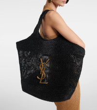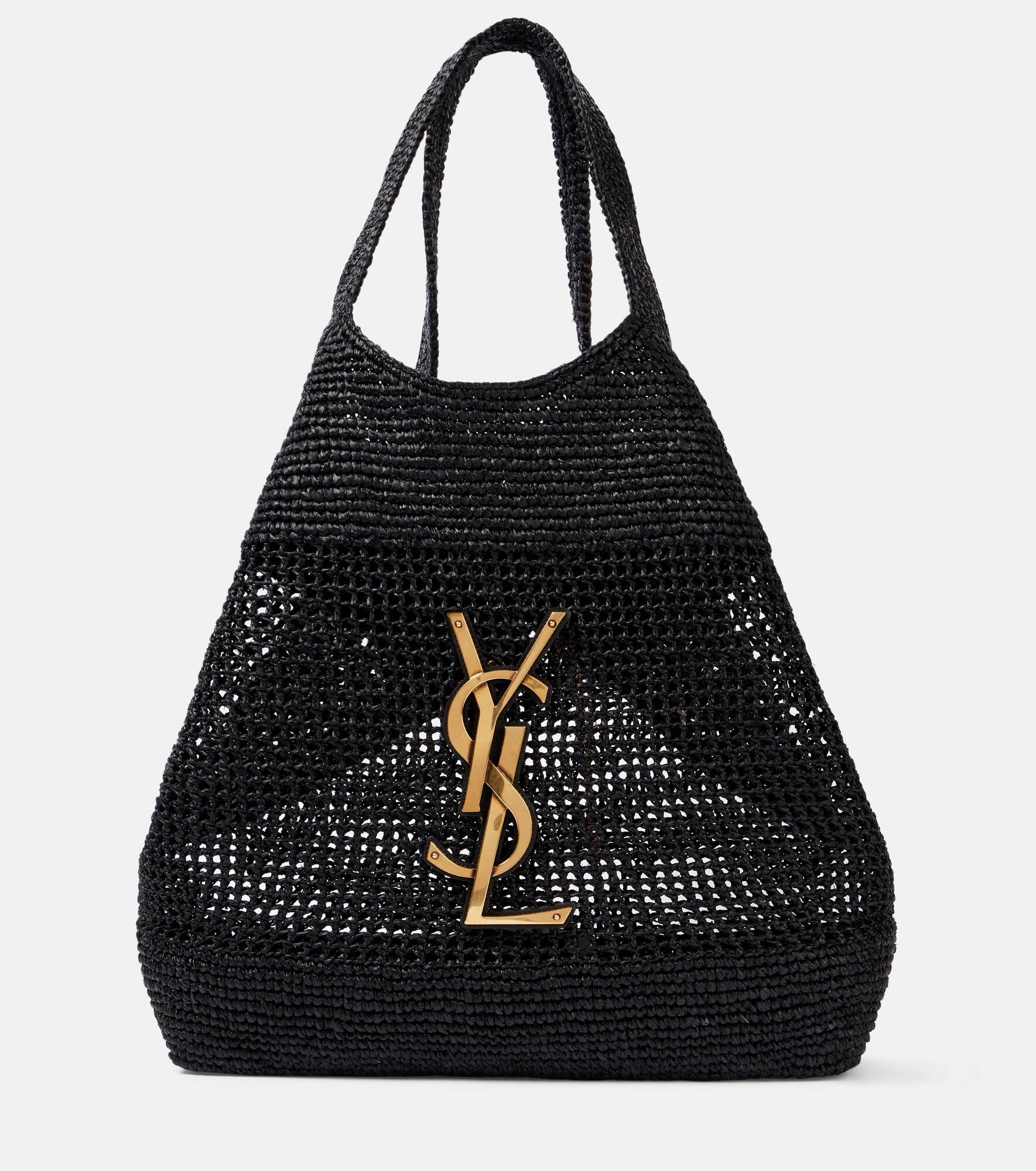 One of the most famous symbols in fashion, the YSL monogram consists of the intertwined initials of Saint Laurent's founder. The Icare Maxi tote bag features the unmistakable motif and is hand crocheted from raffia with vegetable-tanned leather trims. Product Details - Material: raffia - Lining: unlined - Made in Italy - Designer color name: Black - Item color: black - Top handles - Hardware color: gold - Internal details: internal pouch - Item number: P01053050 Size & Fit - Height 40cm-15.5" - Max. width 57cm-22.5" - Depth 8cm-3" - Length of handles 44cm-17.5" - Clutch height 9,5cm-3.5" - Clutch width 20cm-8"