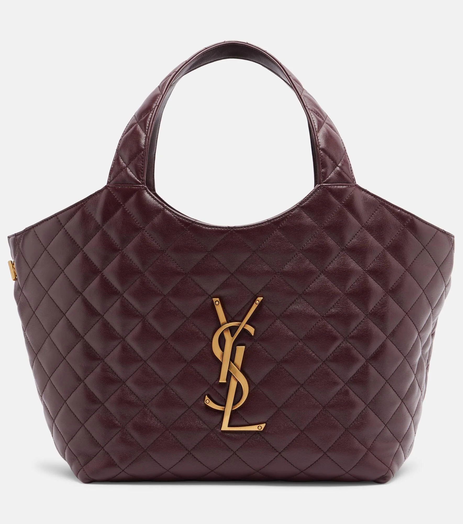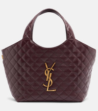 One of the most famous symbols in fashion, the YSL monogram consists of the intertwined initials of Saint Laurent's founder. Crafted from quilted leather, the Icare Medium tote bag features the unmistakable motif and comes with a detachable zipped pouch. Product Details - Material: leather - Lining: fabric - Made in Italy - Color: burgundy - Designer color name: Hot Wine - Trim: leather - Hardware color: gold - Shoulder straps, Detachable shoulder strap - Internal details: internal zipped pocket, single compartment - Closure: open top - Detachable zipped pouch - Includes: dust bag - Item number: P01159758 Size & Fit - Height 24cm-9.5" - Width 48cm-19" - Depth 13cm-5" - Length of handles 44cm-17.5" - Clutch height 12cm-4.5" - Clutch width 20cm-8"