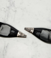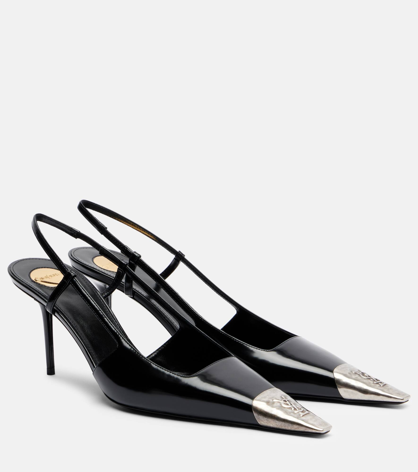 The Jeanne leather slingback pumps by Saint Laurent bring a distinctive touch to your look with their metal cap toes embossed with the iconic Cassandre monogram. The pair sits atop 75mm heels and is finished with elasticated straps. Product Details - Upper: leather, rubber - Lining: leather - Sole: leather insole and sole - Toe shape: pointed toe - Made in Italy - Includes: shoe box, dust bag - Designer color name: Noir - Item color: black, silver - Slingback strap - Item number: P01086679 Size & Fit - Fits slightly large to size - we recommend trying a half size smaller - European sizes - 7,5cm-3" heel (size EU 38)