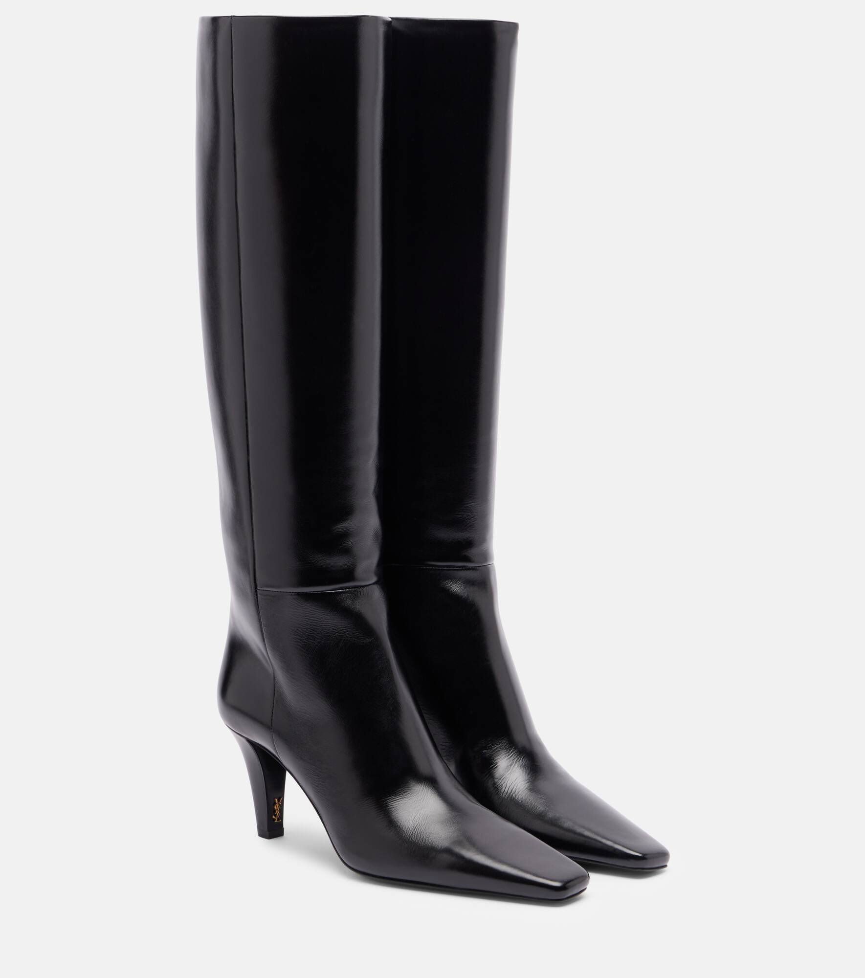 Since its conception in 1961, Saint Laurent has been coveted for its elegant Parisian aesthetic. Crafted from leather, the Jill boots are a knee-high style set atop 75mm heels with the brand's iconic Cassandre logo. Product Details - Upper: calf leather - Lining: leather - Sole: leather insole, leather and rubber sole - Toe shape: pointed toe - Made in Italy - Includes: shoe box, dust bag - Designer color name: Noir - Item color: black - Item number: P01086687 Size & Fit - True to size - European sizes - 7,5cm-3" heel (size EU 38) - 42cm-16.5" shaft height (size EU 38) - 37cm-14.5" shaft width (size EU 38) - shaft width measured on largest part of boot