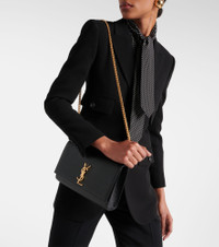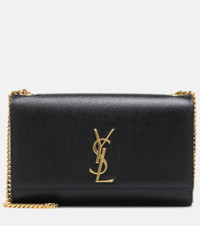 Its easy to see why Saint Laurent's Kate bag, with its glossy golden-hued YSL monogram and sleek silhouette, sits at the top of many wishlists. This Italian-crafted piece dangles from a shiny chain strap, and its leather lined interior closes with magnetic fastening to complement the envelope design. Swing yours over a tailored blazer to emulate the label's aesthetic. Product Details - Material: calf leather - Lining: leather - Made in Italy - Includes: dust bag - Designer color name: Nero - Color of chain strap: gold - Internal details: internal slot pocket - Closure: magnetic fastening - Chain shoulder strap - Item number: P00361038 Size & Fit - Height 15cm-6" - Width 24cm-9.5" - Depth 5cm-2" - Chain length 102cm-40"