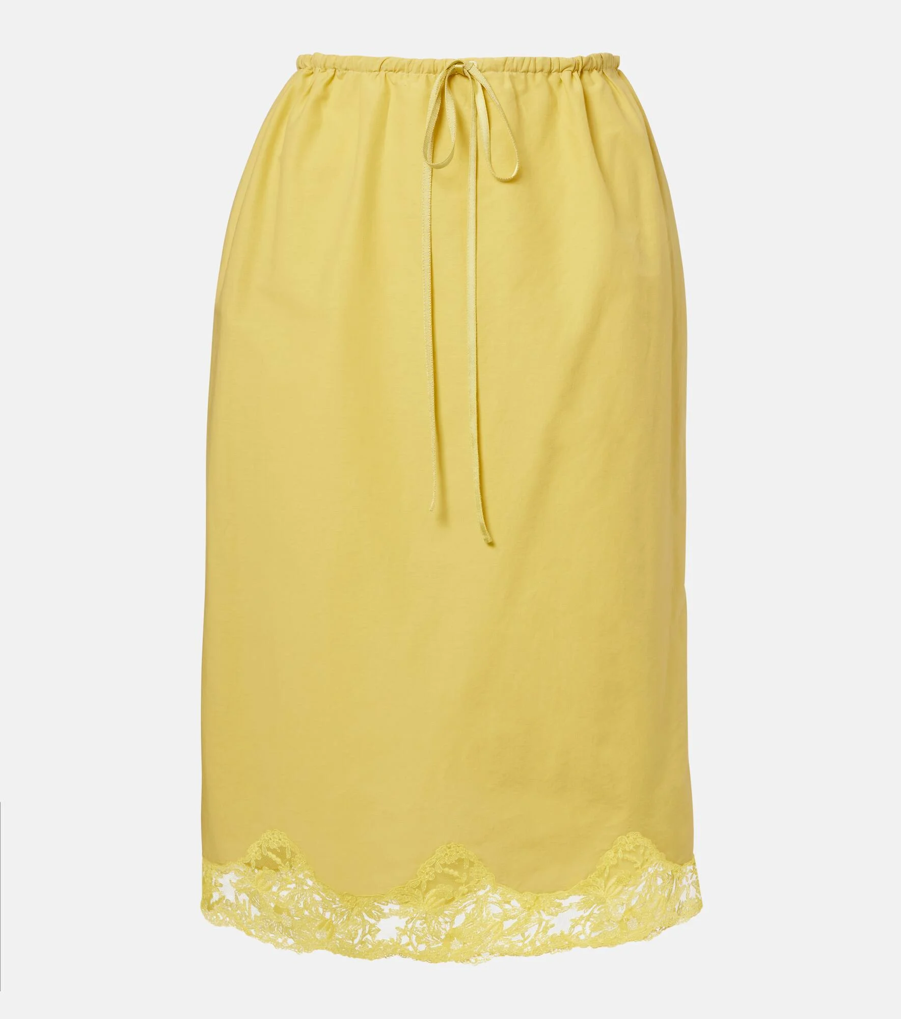 Since its conception in 1961, Saint Laurent has been coveted for its elegant Parisian aesthetic. This midi skirt is made from a lustrous silk and cotton blend and adorned with a silk ribbon drawstring and trimmed with lace. Product Details - Material: 84% cotton, 16% silk - Care instructions: dry clean - Made in Italy - Color: yellow - Designer color name: Janue - Trim: 100% polyester - Elasticated drawstring waist - Item number: P01128194 Size & Fit - True to size - Close fit at the hips - Adjustable at the waist - Non-stretchy fabric - Sits low on the hips - The model seen in the picture is 178cm-5'10" and wearing a size FR 34