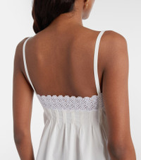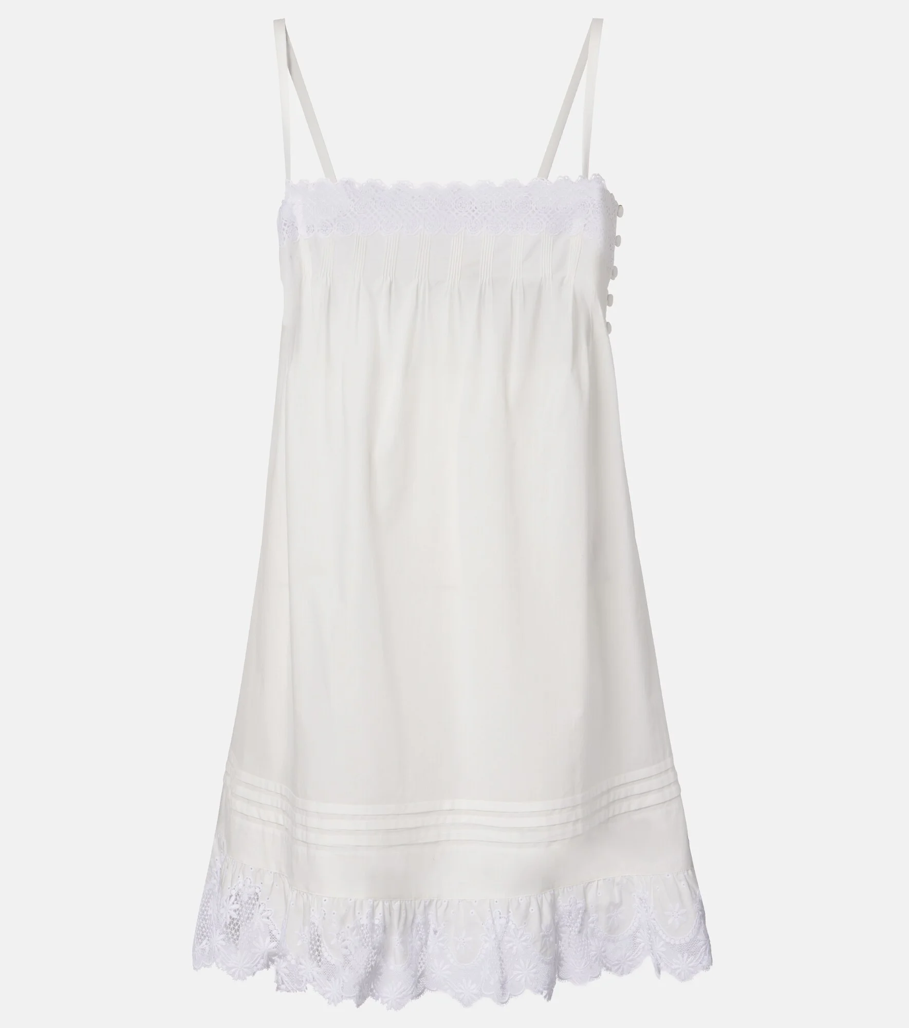 Since its conception in 1961, Saint Laurent has been coveted for its elegant Parisian aesthetic. Inspired by lingerie codes, this slip dress is made from pure cotton with slender straps and delicate lace trims. Product Details - Material: 100% cotton - Care instructions: dry clean - Made in Madagascar - Color: white - Designer color name: Craie - Material II: 100% polyamide - Lace: 86% viscose, 14% polyamide - Trim: 100% polyamide - Closure: snap-buttoned sides - Item number: P01128190 Size & Fit - True to size - Designed for a loose fit - Non-stretchy fabric - If you wear a C cup or bigger, we recommend trying one size larger - Height of model is 174cm-68.5" and wears a size FR 34
