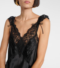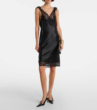 Balancing minimalism with distinctive detailing, this Saint Laurent slip dress makes a lasting impression. The garment is made from silk satin, and the lace shoulder straps and V-neckline are adorned with two charming self-tie ribbons. Product Details - Material: 100% silk - Care instructions: dry clean - Made in Italy - Designer color name: Noir - Item color: black - Lace: 37% viscose, 36% cotton, 27% polyamide - Item number: P01086638 Size & Fit - True to size - Low back - Cinched waist - Non-stretchy fabric - The model seen in the picture is 178cm-5'10" and wearing a size FR 34