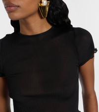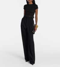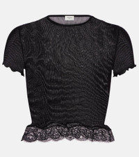 Since its conception in 1961, Saint Laurent has been coveted for its elegant Parisian aesthetic. Featuring an exquisite lace trim at the hem, this semi-sheer top is expertly made from soft silk and complete with frilled cuffs. Product Details - Material: 100% silk - Care instructions: machine wash at 30 degrees - Made in Italy - Designer color name: Noir - Item color: black - Details: 79% polyamide, 21% viscose - Item number: P01078592 Size & Fit - True to size - Semi-sheer - Fitted - Stretchy fabric - Cropped - The model seen in the picture is 178cm-5'10" and wearing a size XS