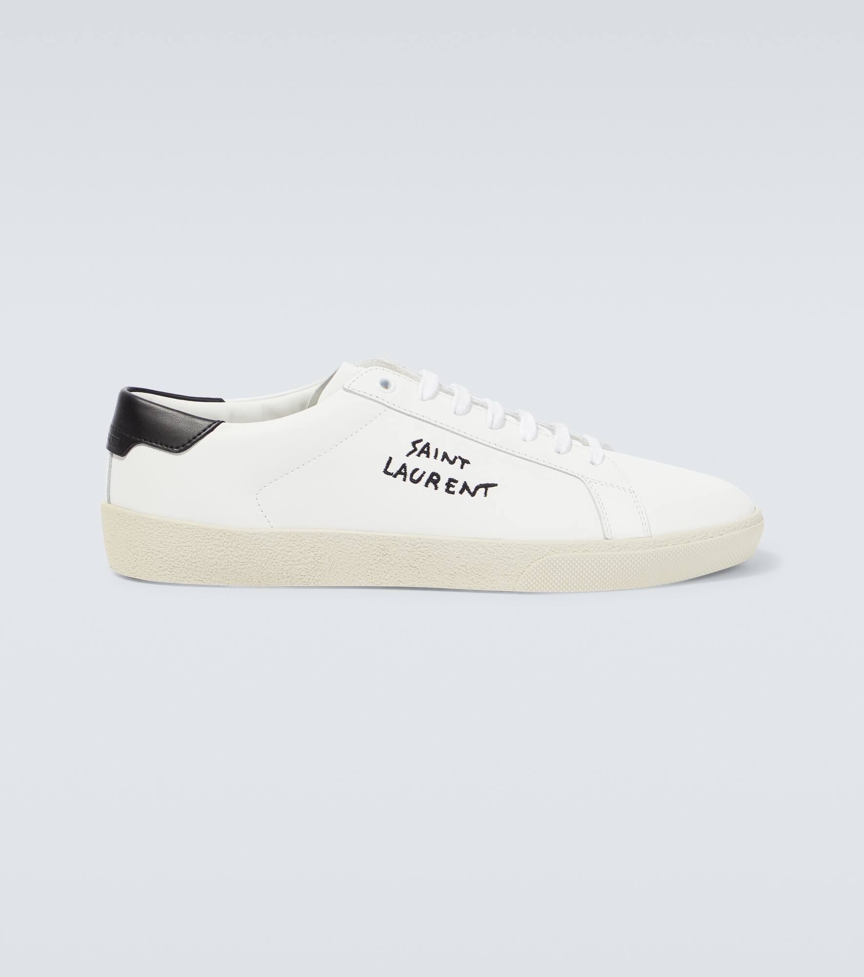 These low-top sneakers from Saint Laurent are made from leather and feature logo embroidery with contrast thread. This lace-up design was made in Italy and comes with round toes and rubber soles. Product Details - Lining: leather - Sole: leather insole, rubber sole - Toe shape: round toe - Comes with extra laces - Closure: lace-up - Made in Italy - Comes with dust bags - Upper: leather - Comes with a box - Item number: P00786693 Size & Fit - Fits slightly large to size - we recommend trying a half size smaller - European sizes