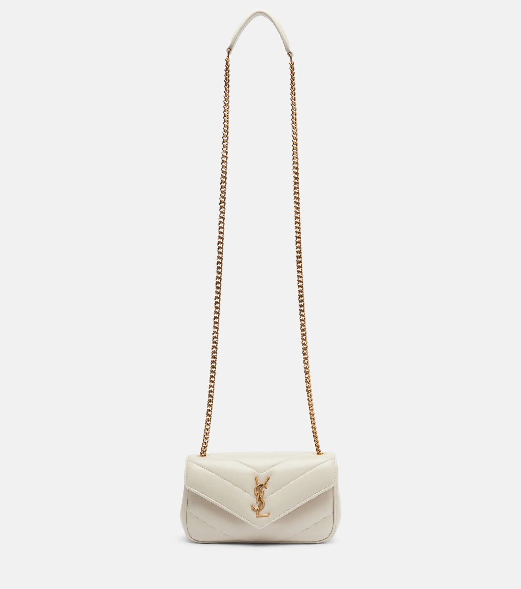Since its conception in 1961, Saint Laurent has been coveted for its elegant Parisian aesthetic. Made from chevron-quilted leather, the Lou Lou Mini crossbody bag features gold-toned hardware and hangs from a chain strap. Product Details - Material: lamb leather - Lining: leather - Made in Italy - Designer color name: Blanc Vintage - Item color: white - Hardware color: bronze - Chain and leather shoulder strap - Internal details: internal slot pocket, card slot, single compartment - Detachable pouch - Closure: magnetic fastening - Includes: box, dust bag - Item number: P01106621 Size & Fit - Height 12cm-4.5" - Width 19,5cm-7.5" - Depth 4,5cm-2" - Chain length 113cm-44.5"