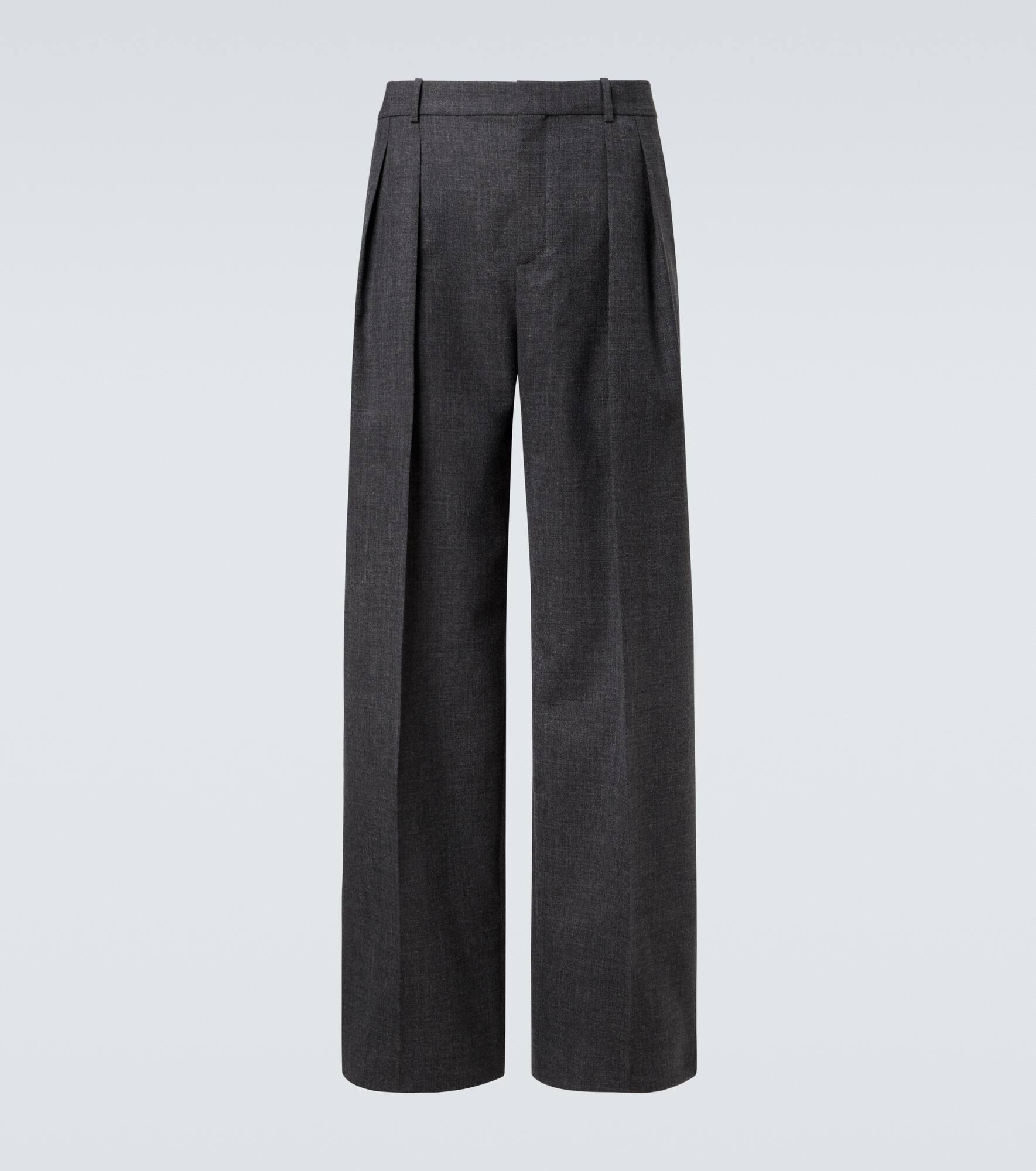Since its conception in 1961, Saint Laurent has been coveted for its elegant Parisian aesthetic. Made from wool chine, these tailored pants are cut to a wide-leg silhouette with a low-rise waistline. Product Details - Material: 100% wool - Care instructions: dry clean - Made in Italy - Designer color name: Gris Chine - Item color: gray - Lining: 97% cotton, 3% elastane - Contains non-textile parts of animal origin - Closure: zipper fly, button and hook fastenings - Pockets: side slit pockets, back pockets - Belt loops - Item number: P01108129 Size & Fit - Unhemmed for tailoring - Height of model is 192cm-75.5" and wears a size 50