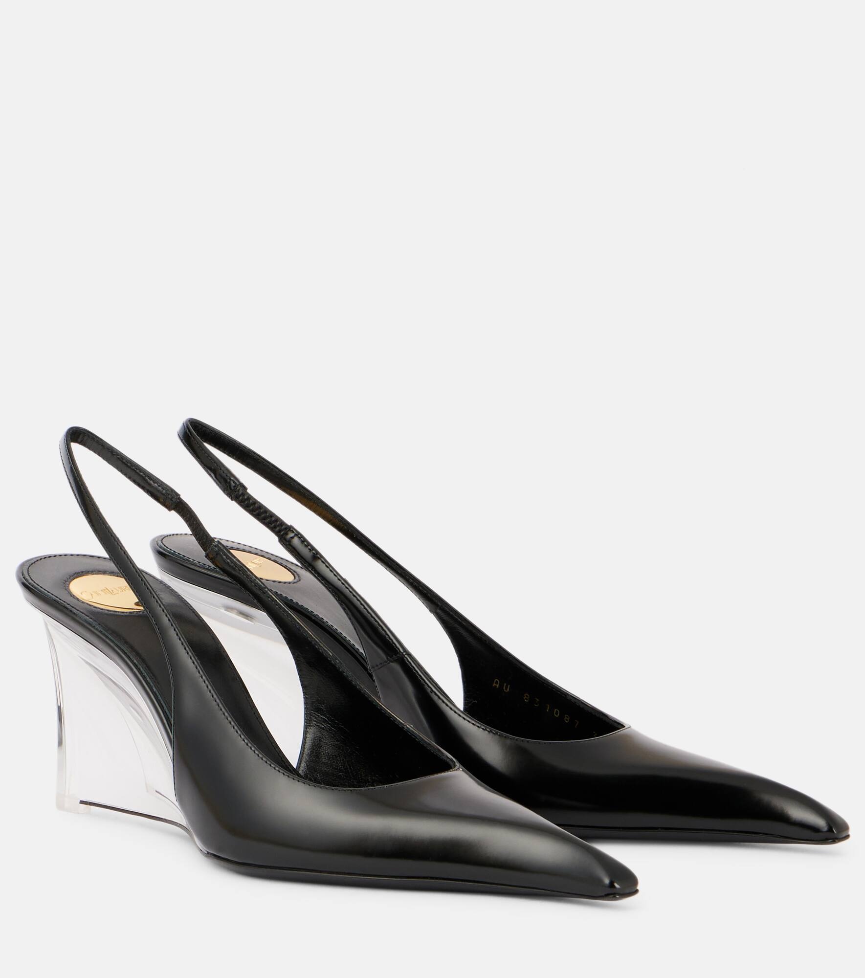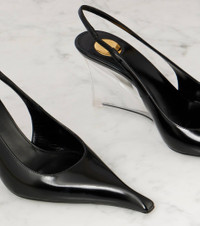 Product Details - Upper: leather - Lining: leather - Sole: leather insole and sole - Toe shape: pointed toe - Made in Italy - Includes: shoe box, dust bags - Designer color name: Noir/ Transparent - Item color: black - Closure: elasticated strap - Hardware color: gold - Details: plastic - Item number: P01026996 Size & Fit - True to size - Slightly narrow at the toe - European sizes - 8cm-3" heel (size EU 38)